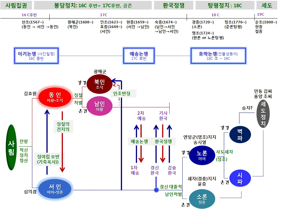 그 후 조정은 서인의 한 갈래인 '노론'이 장기 집권한다. 노론의 거두 '송시열'은 조선 최고의 중화 사대주의자다. '이황'과 '이이'로 시작한 조선의 당쟁은 안동 김 씨의 세도정치로 막을 내린다. 마치 "탕수육을 소스에 찍어 먹느냐, 소스를 부어 먹느냐"로 쌈박질하다가, 찍어 먹든, 부어 먹든 탕수육은 안동 반점에서 시키는 걸로 결론난 셈이다.