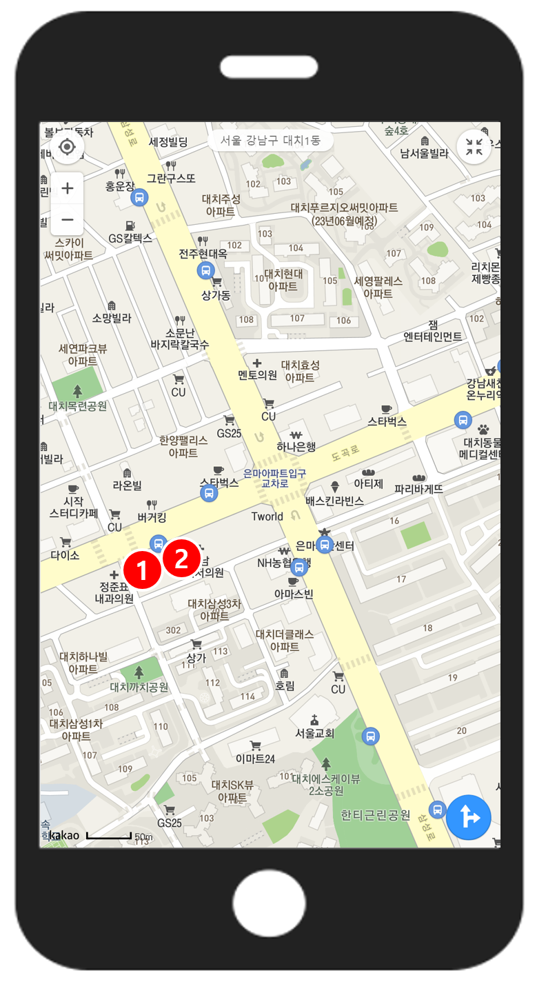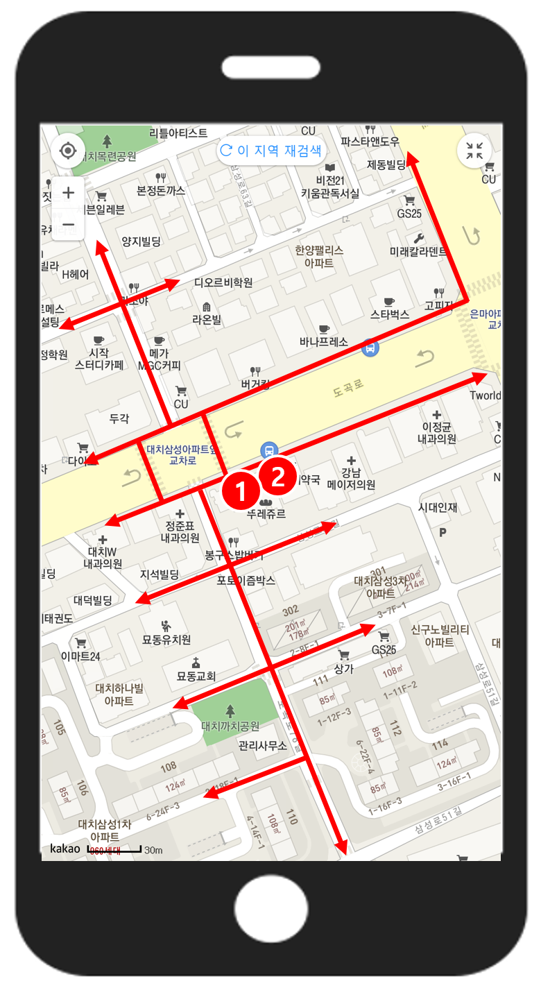 ①파리바게뜨와 ②뚜레쥬르의 입지 (ⓒ카카오맵)대치동 은마사거리 학원가 중 대치역 방향 남쪽 블록 상권에는 약 10개의 제과점이 영업 중이다.
