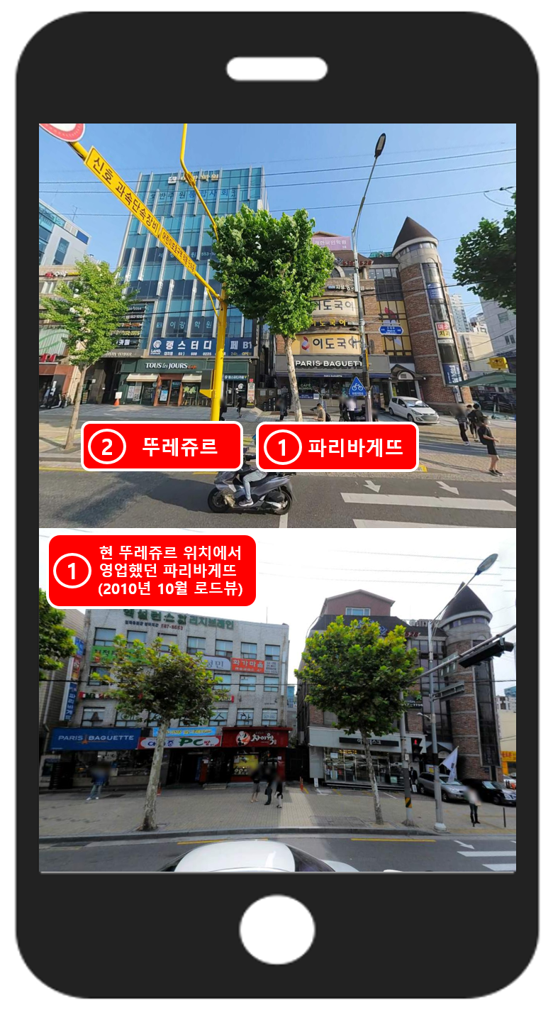 은마사거리를 두고 좌우 양 옆으로 파리바게뜨는 2개점이나 운영 중인 것이다. ① 파리바게뜨는 현재의 ②뚜레쥬르 위치에서 오래전부터 영업해 오다가 건물 리모델링에 따라 현재의 입지로 2011년 7월에 이동하여 현재까지 영업을 이어 오고 있다.