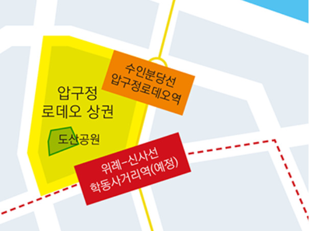 주로 학동사거리와 도산공원을 중심으로 상권이 발달중 이다.