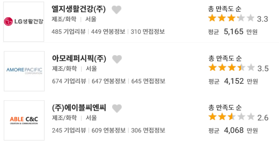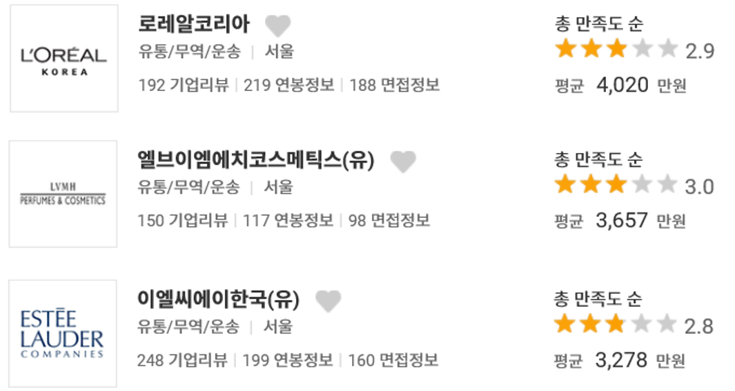 다음은 "잡플래닛"에서 공개한 화장품/뷰티 부문 대표 회사들의 평균 연봉을 참조하면 된다.