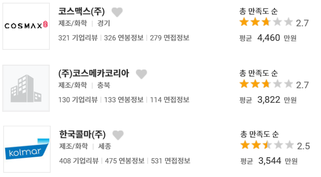 다음으로 평균 연봉이 높은 곳은 "코스맥스(주)로서 평균 연봉이 4460만 원"으로 나타났다. 코스맥스(주)는 100여 개 국가, 600여 개의 브랜드에 화장품을 공급하고 있는 ODM 회사이다.