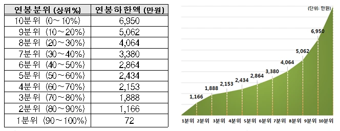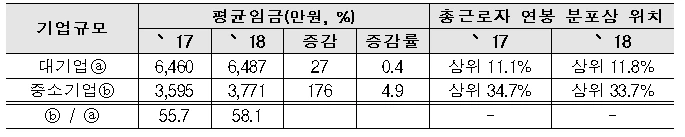 한국경제연구원에 따르면, 우리나라 근로자의 "2018년 평균 연봉은 3,634만 원"으로 조사되었다. 중간 순위에 해당하는 연봉은 2864만 원 정도로 조사되었고, 연봉이 6950만 원 이상이면 상위 10%에 해당한다고 한다. 특히 기업 규모별 정규직 근로자의 평균 연봉은 대기업이 6487만 원, 중소기업이 3771만 원으로 나타났다. 2017년 대비 대기업의 평균 연봉은 27만 원 증가(0.4%)한 반면, 중소기업의 평균 연봉은 176만 원(4.9%)이나 올랐음에도 격차는 여전히 큰 편이라고 한다.