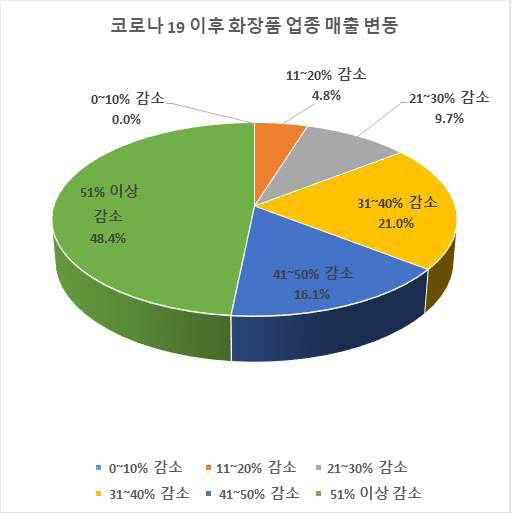 조사에 참여한 가맹점 중 도 소매업과 서비스업의 매출 하락이 심각한 것으로 나타났는데, 특히 화장품 가맹점의 48.4%(응답자 150명/조사자 310명), 이미용 가맹점의 52.3%(응답자 23명/조사자 44명)는 코로나19가 발생하기 전과 비교하여 매출의 절반 이상이 하락하였다고 답했다.