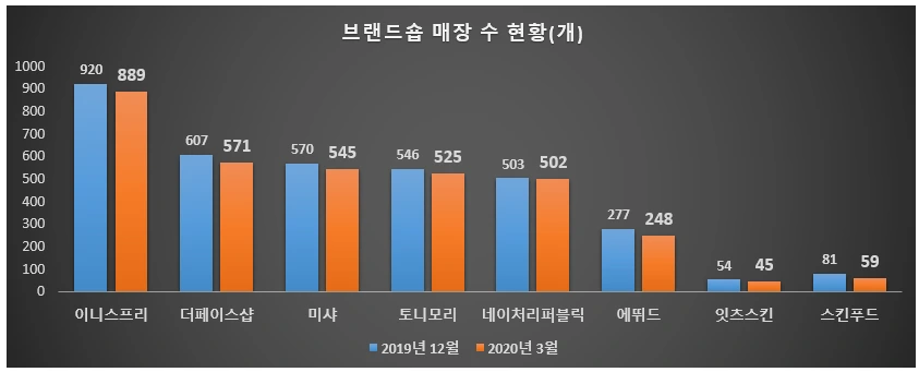 이니스프리는 지난해 920개의 매장을 운영 중이었으나 지금은 31개가 줄어든 889개가 영업 중이다. 더페이스샵과 미샤, 토니모리도 각각 4~6% 매장 수가 줄어들었다. 에뛰드는 10%, 잇츠스킨은 17%의 매장이 줄었다. 스킨푸드는 지난해 81개 매장에서 22개를 철수하여 현재 59개만 영업 중이며, 3개월간 폐점한 매장이 전체의 27%로서 가장 폐점률이 높은 브랜드숍이 되었다.