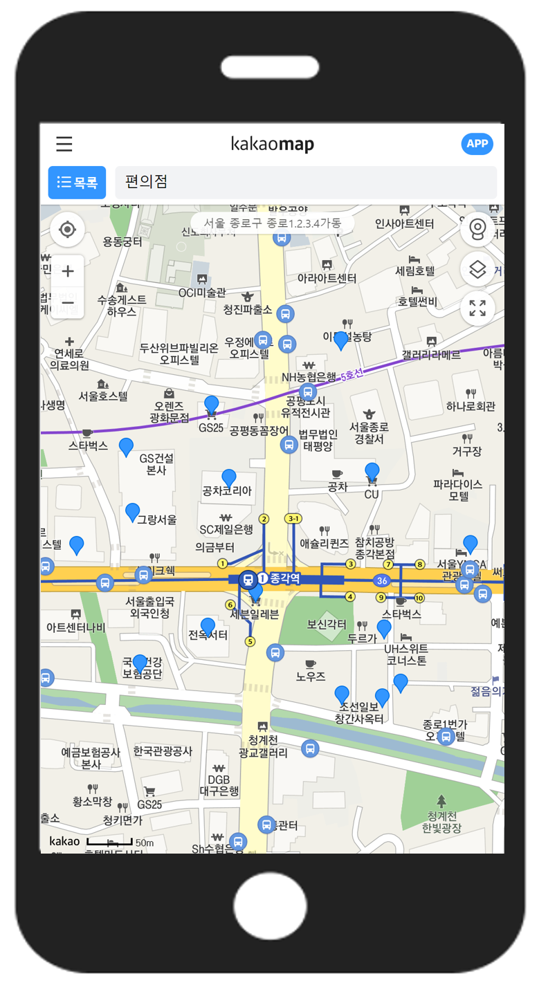 입지조사는 배후수요와 주동선을 파악할 수 있는 매우 중요한 정보가 됩니다. 역세권과 횡단보도, 교차로 사거리 등 주동선을 파악하고 유동인구가 모이는 입지를 파악합니다. 스마트폰의 카카오맵과 같은 지도 어플을 통해 상가건물의 주변을 탐색하면 좋습니다. 지하철, 버스정류장, 음식점, 숙박업소, 카페, 주유소, 주차장, 은행, 편의점, 대형마트, 병원, 약국 등 주요 업종이 어떻게 분포되어 있는지 확인합니다. 업종의 분포도를 통해 배후수요와 유동인구가 어느 방향으로 흘러가고 모이는지도 파악이 가능합니다. 왜냐하면 상가건물은 주로 사람들이 이용하는 동선으로 형성되기 때문입니다.