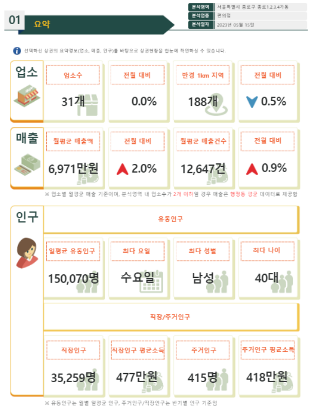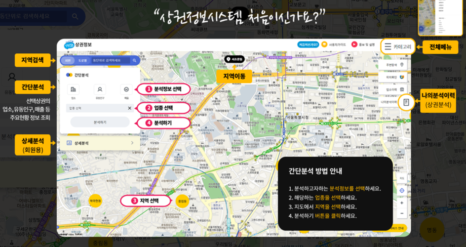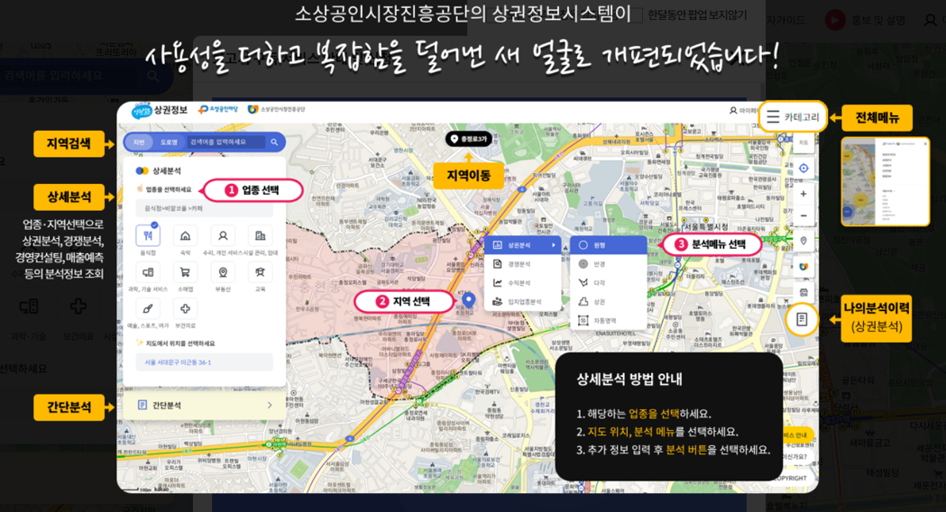 따라서 상권정보시스템과 실제 현장을 비교, 분석함으로써 예비 임대인은 투자하려는 상가건물의 장, 단점을 미리 예측할 수 있고, 현재 임대인은 현재와 미래의 임대료를 책정하는 데 있어 큰 도움을 받을 수 있을 것입니다.