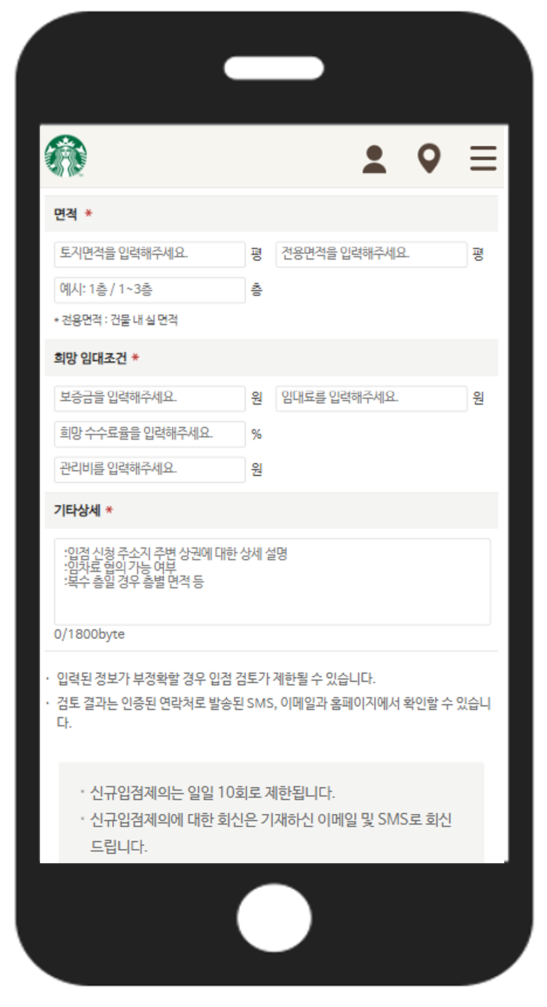 스타벅스의 입점 제안 양식 (ⓒ스타벅스 홈페이지)스타벅스는 주변 경쟁점의 매출이나 영향관계를 토대로 예상매출과 임대차 계약조건을 스타벅스가 유리하게끔 정하고, 그 조건에서 계약을 하자며 건물주를 설득시키려 할 것이다. 사실 스타벅스뿐 만 아니라 모든 프랜차이즈 업종이 매출대비 적정 임대료를 15~20% 정도로 나오게끔 건물주와 협상을 시도한다.