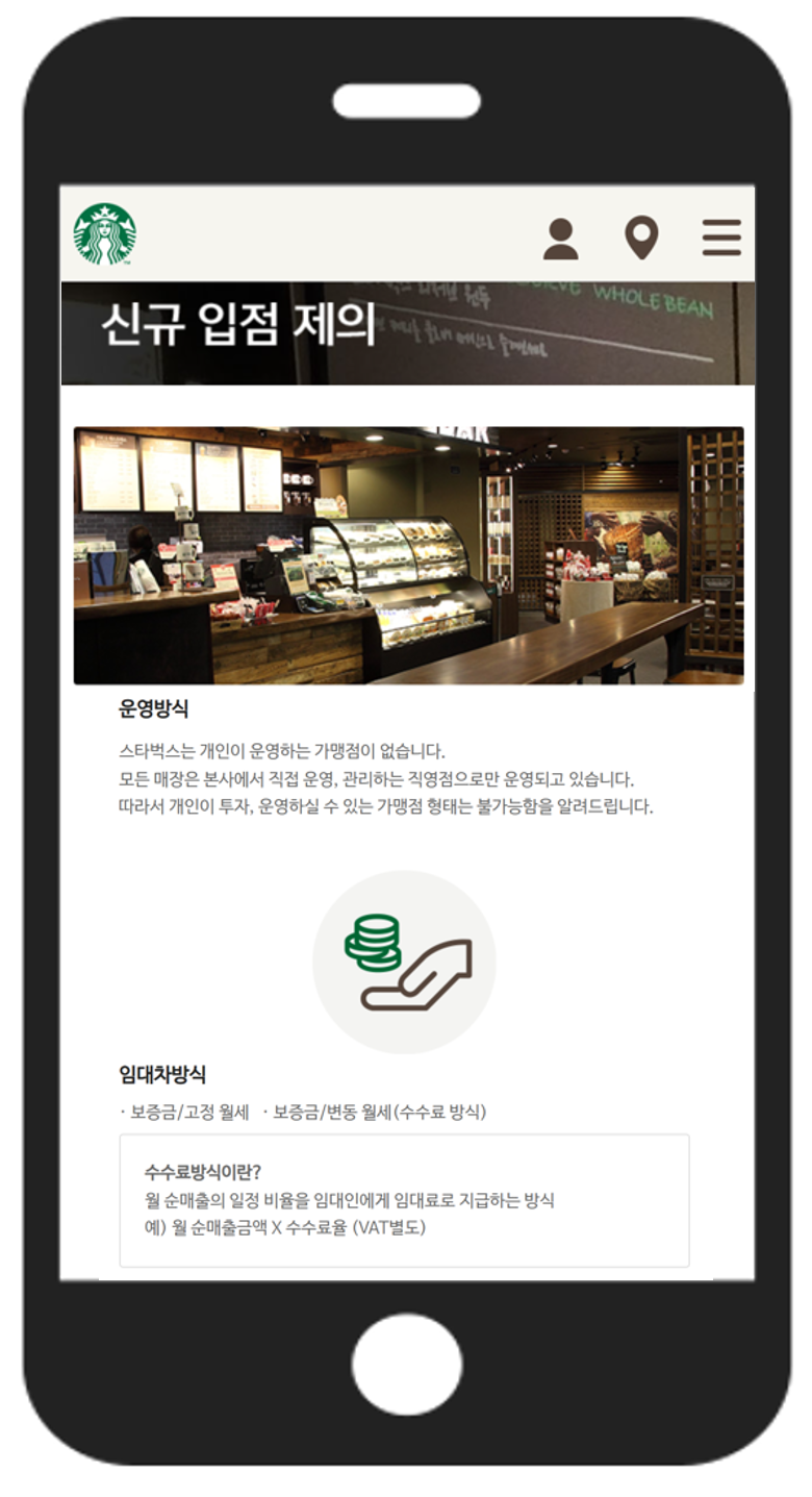 스타벅스의 임대차방식 (ⓒ스타벅스 홈페이지)스타벅스의 임대차 계약조건은 고정 임대료 방식과 변동 임대료(수수료) 방식이 있다. 고정 임대료 방식은 매월 고정적인 금액의 임대료를 받기 때문에 건물주가 임대료에 대해 신경 쓸 것이 없다.