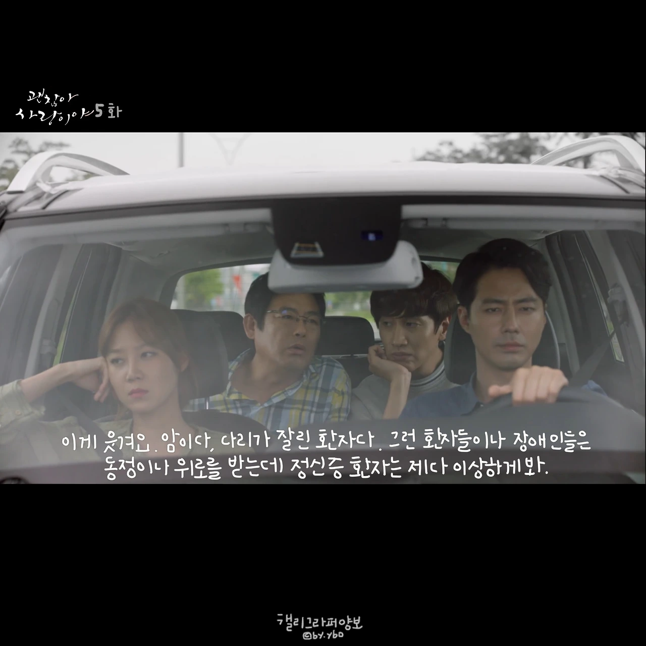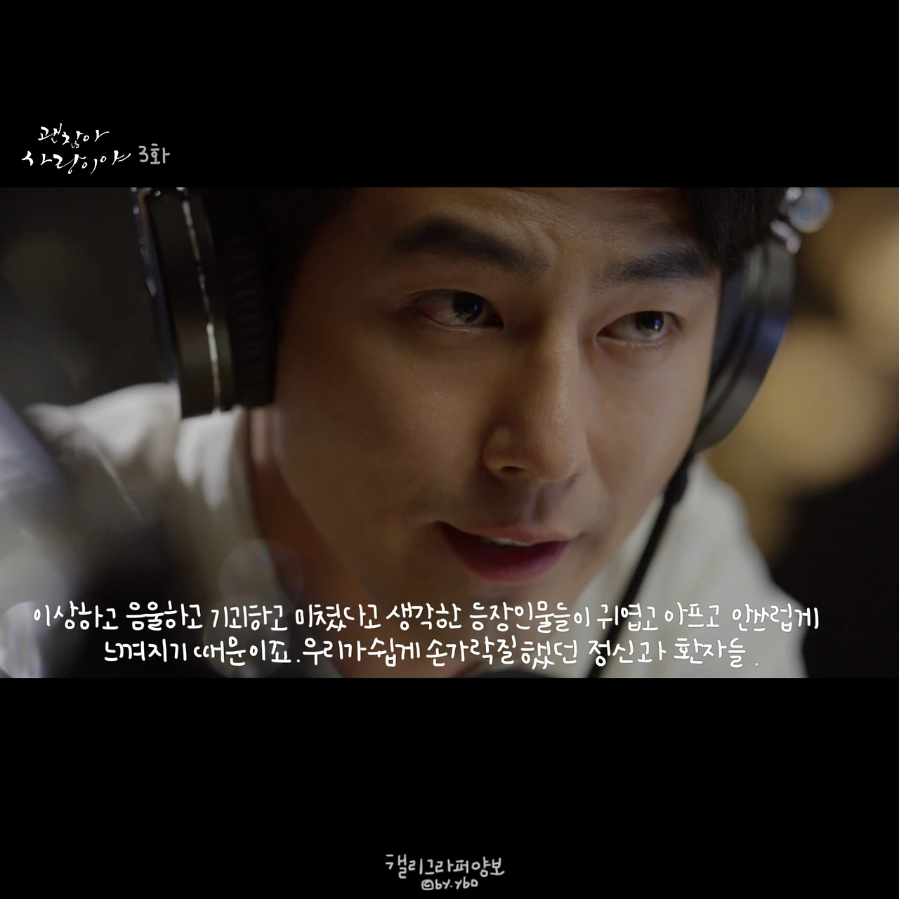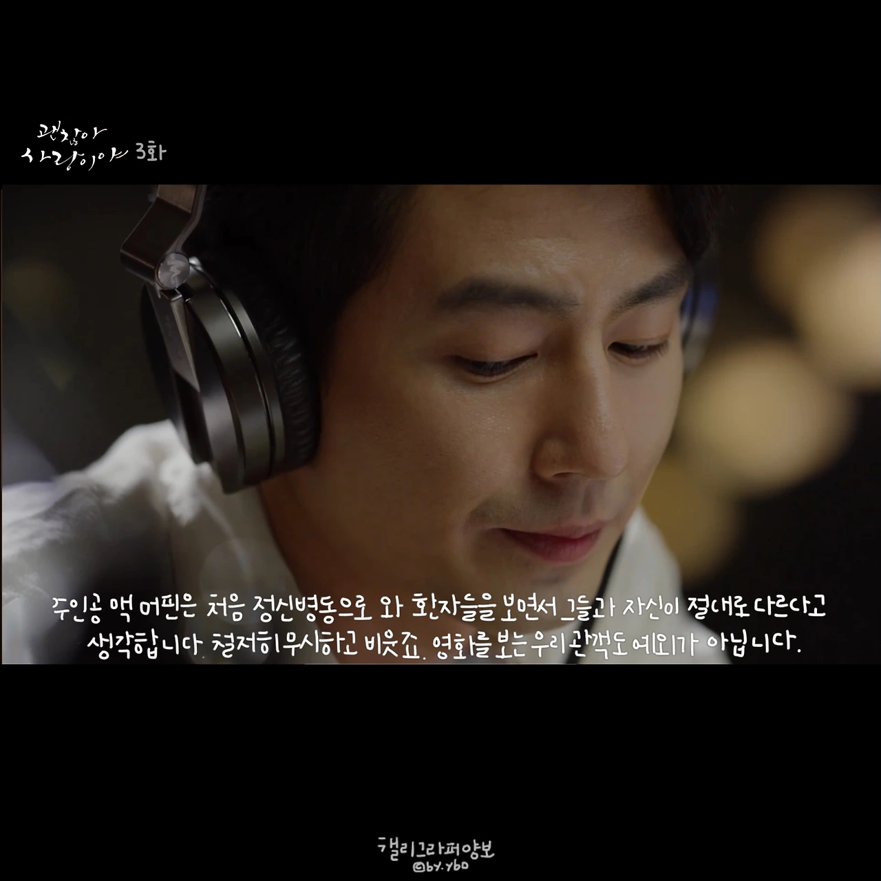 “정신과 의사들은 말합니다. 우리 모두 환자다. 감기를 앓듯 마음의 병은 수시로 온다. 그걸 인정하고 서로가 아프다는 걸 이해해야 한다. 그러면 세상은 지금보다 조금 더 아름다워질 것이다. 많은 사람들이 각자 다른 생각을 갖는 걸, 우리는 그가 그 사람이 나와 다르니까 틀렸다고 생각합니다. 무서운 오류죠.”