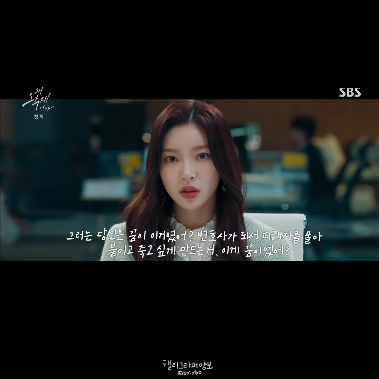 그래서 박소영이 오수재에게 던진 질문은 그녀가 왜 오수재여야 하는지, 자신이 왜 변호사가 됐고, 자신을 왜 변호사로 고용해야하는지에 대한 답을 찾게 할 열쇠가 될 것 같다. 그리고 왜 오수재인가, 하는 질문에 그녀가 답을 찾아가는 과정은 그 질문을 시청자에게 향하게 할 것이다. 나는 그 질문을 이어받아 곱씹고 있을 내가 눈에 선하다. 아무래도 이 드라마는 법정 추리보다 주인공의 성장에 초점을 두는 게 작품을 조금 더 잘 즐기는 방법이 될 듯싶다.