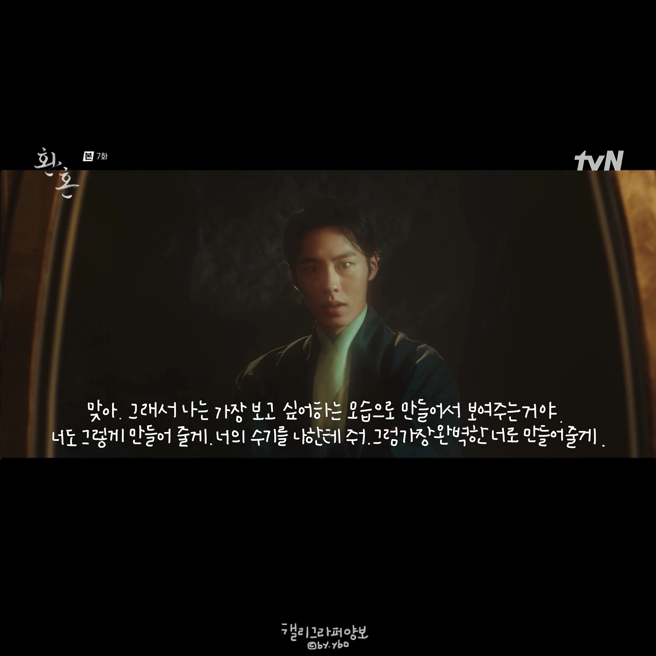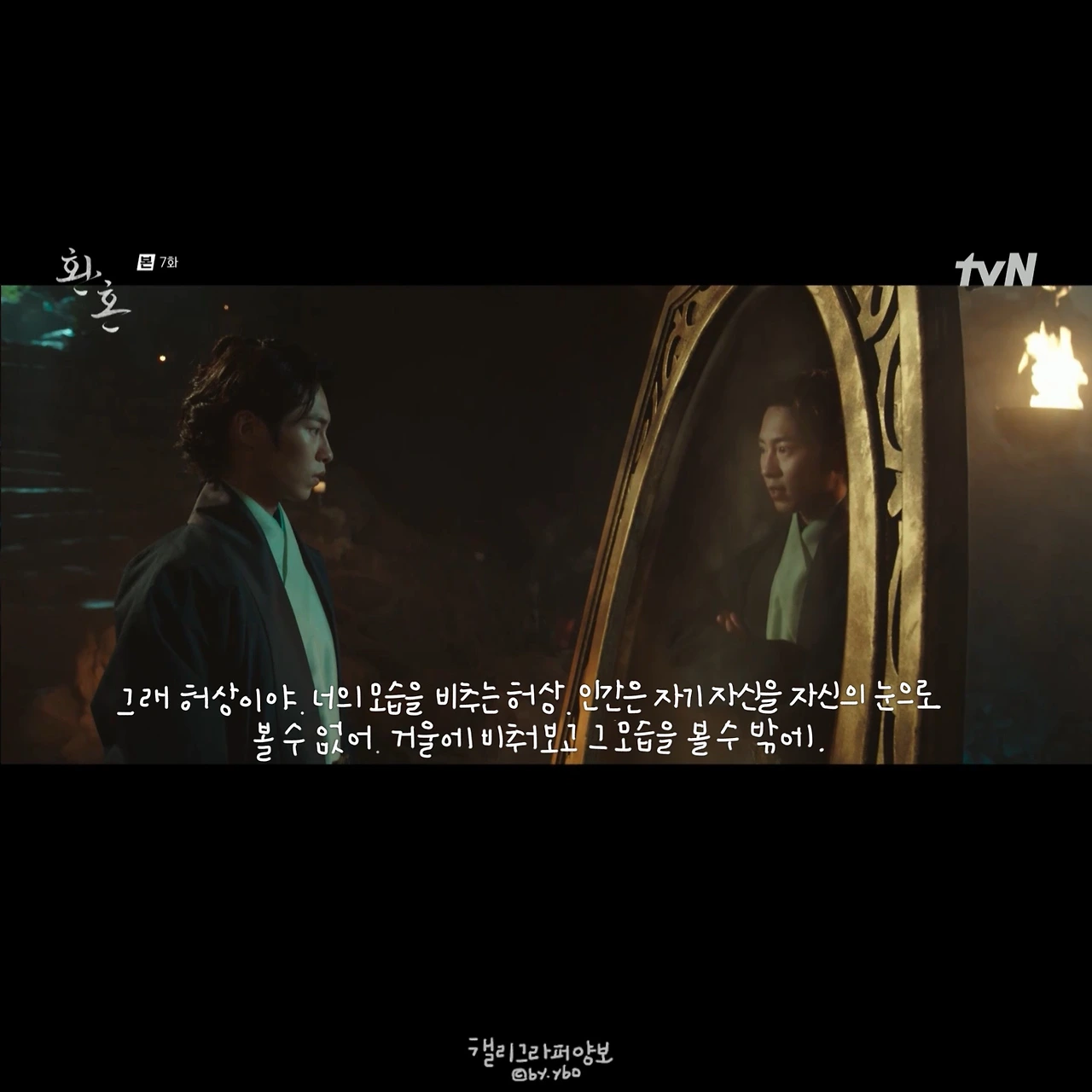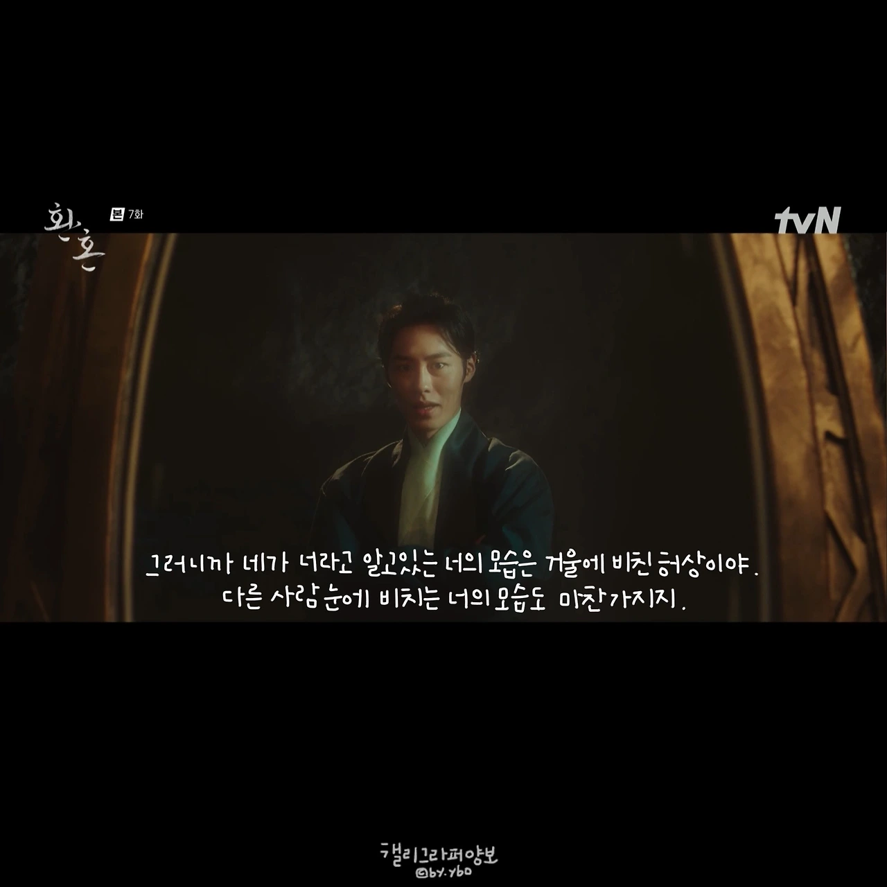 ‘거울’과의 대화는 드라마 <환혼(tvn, 2022)> 7회 속 장면으로 말을 걸어온 ‘거울’은 사람의 마음을 홀려 그 영혼을 취하는 요물이다. 이 요물은 장욱(이재욱 분)에게 네가 원하는 모습, 사람들이 네게 바라는 모양의 ‘가장 완벽한’ 너를 줄 테니 네가 가진 수기를 달라고 유혹한다.