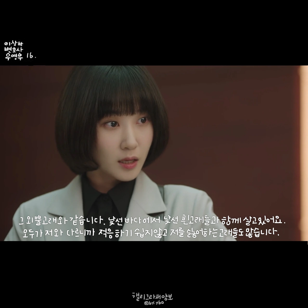 드라마에서 보는 이로 하여금 마음 조마조마하게 했던 영우 출생의 비밀은 모두가 예상한 대로, 깊은 바다가 고래의 비밀을 감춰주었다. 나는 이러한 엔딩 속에 또 한 번 바다가 고래를 지켜주는 일에 대해 생각하게 된다. 기회를 주는 것과 더불어 우리 한 사람, 한 사람이 모여 이루는 바다가 되는 일에 대해, 비록 드라마 속 이야기는 끝이 났지만 우리의 이야기는 계속 이어져야 한다고. 2024년에 제작, 방영될 우영우 시즌2에는 실제로 변화된 우리의 이야기가 담겨, 판타지란 수식어를 기분 좋게 떼어낼 수 있게 말이다.