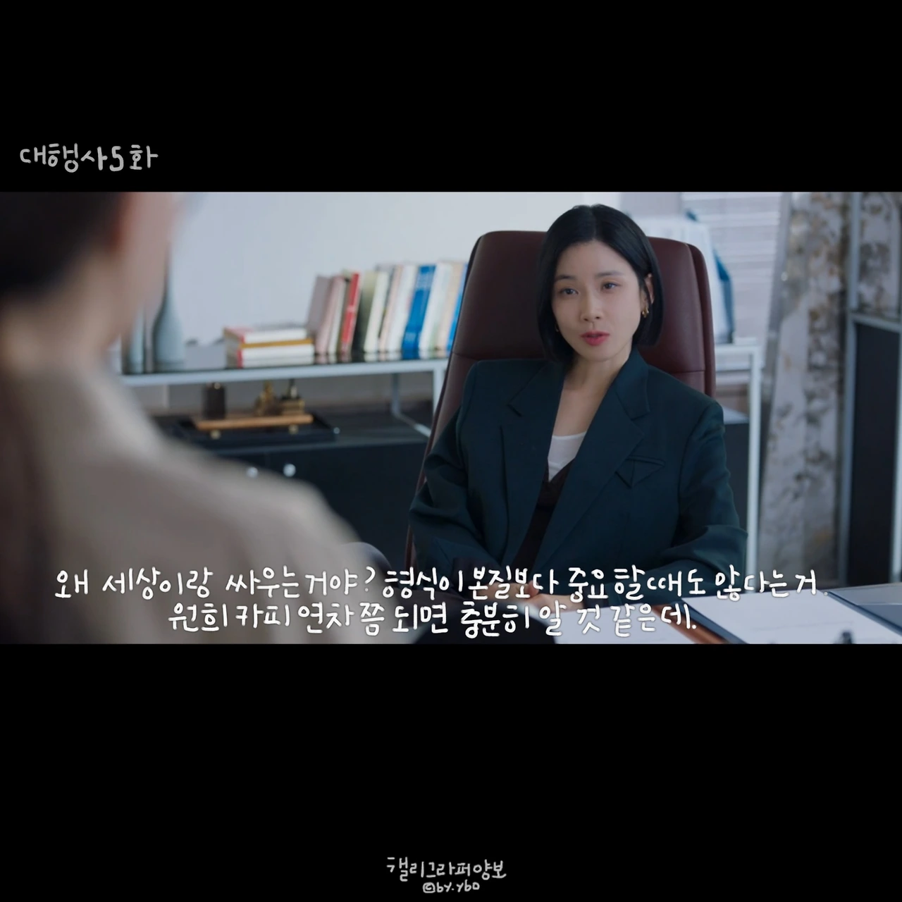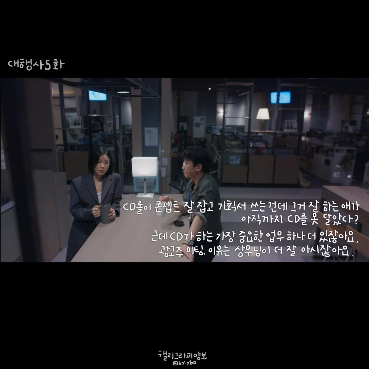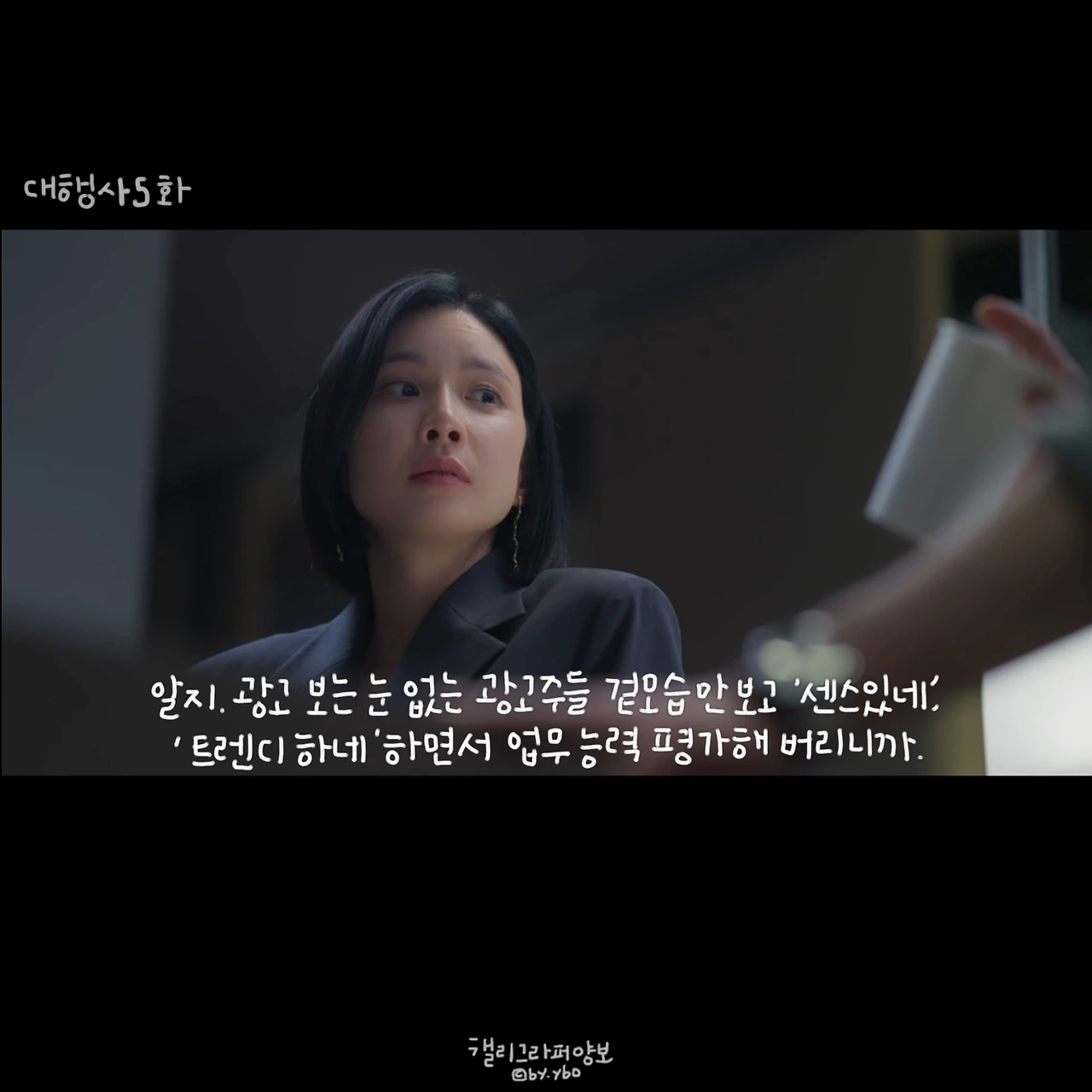 고아인이 선보이는 거침없는 행보는 광고대행사에 신으로 불리는 광고주들에게 금요일 업무 지시 후 월요일까지 제출 요구 거부, 광고주 개인적인 업무 지시 거부라는 폭탄 메일을 보낸 지점에서 대행사에 다녀 본 적도 없는 나까지도 ‘고아인 용비어천가’를 부르게 했다. 물론 이 또한 그녀에게 불리한 바람의 방향을 바꾸기 위한 전략적 행동이었지만 결과적으로 업계의 잘못된 관행이 바뀌는 계기가 된다. 밑에서 차근히 올라왔기에 알 수 있던 불합리함 들이었고, 지금 우리가 원하고 바라는 리더의 모습이기도 하다.