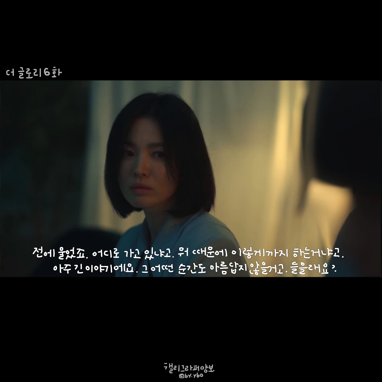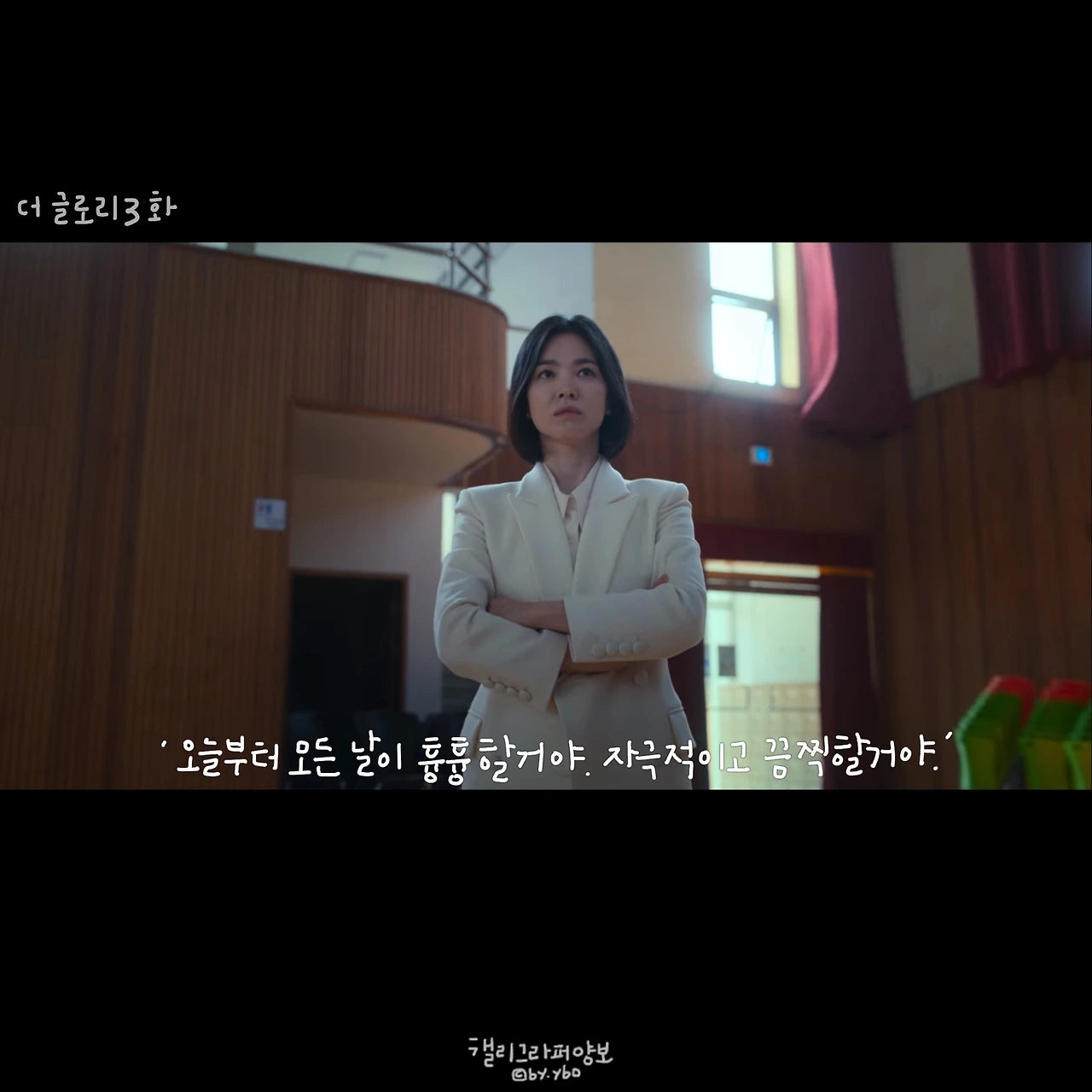 드라마 <더 글로리>는 ‘유년 시절 폭력으로 영혼까지 부서진 동은(송혜교 분)이 온 생을 걸어 치밀하게 준비한 처절한 복수극’이다. 드라마를 시청하기 전, 주인공이 당한 학교 폭력 장면의 수위가 이제까지 드라마에 나왔던 장면들에 비해 훨씬 높다고 들었다. 실제로 연진(임지연 분)과 친구들이 동은에게 한 짓은 정말로 잔인했다. 난폭했고 잔혹했다. 한 인간을 어디까지 망가트리고 무너지게 만들 수 있는지 그리고 인간이 얼마나 추악해지고 어디까지 떨어질 수 있을지. 어느 쪽도 가늠할 수 없을 만큼 지독했다.