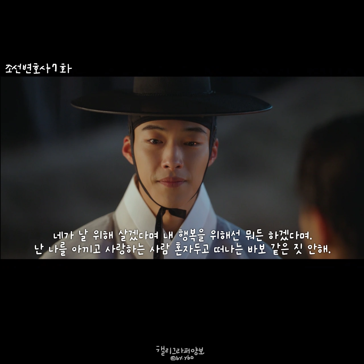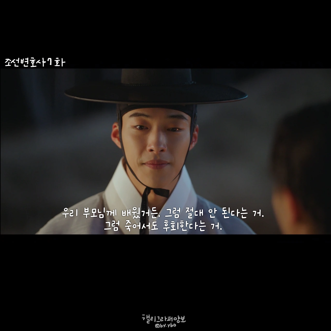 그리고 중반부에 이른 이야기에서 강한수는 시작은 복수였으나 지금은 그게 다가 아니라고 말한다. 사람답게 살고 싶어 졌고 진짜 외지부가 되고 싶어서, 억울한 사람이 있고 그를 도울 방법이 있는데 자신만 살겠다고 도망갈 수 없다고 한다. 내게 이 장면은 주인공은 정의로워야 한다는 이야기 속 구조에 의해 만들어진 변화가 아닌, 비슷비슷한 변호사 이야기 속에 드라마 <조선 변호사>가 다른 빛을 내기 시작하는 지점이자 내가 찾은 특별한 순간이었다.