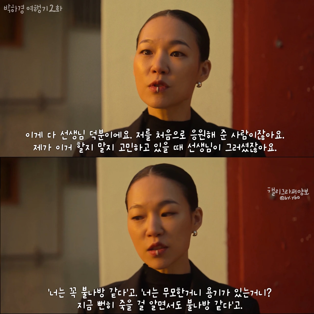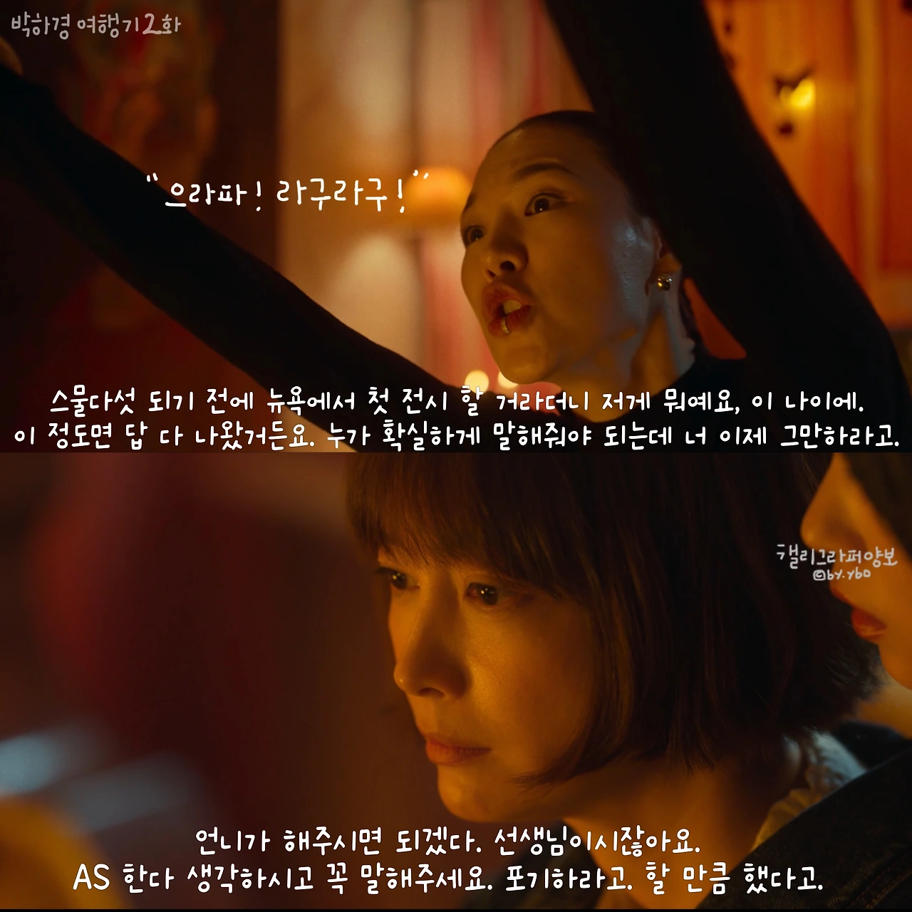 연주에게 하경은 자신을 처음으로 응원해 준 사람이었다. 뻔히 죽을 걸 알면서도 그 길을 가려하는 게 불나방 같다던, 칭찬이라 했던 하경의 모든 말을 연주는 기억하고 있다. 그리고 그 응원이 ‘불나방’으로 그가 추구하는 작품의 세계관이자 정체성이 되었다. 붉은빛으로 가득했던 방의 분위기도, 바닥에 누워 발버둥 치던 모습도 모두 ‘불나방’을 연상시킨다(심지어 축하 떡에도 불나방 모양이 찍혀있었다). 그럼에도 골목에서 하경에게 말하는 연주를 보는데 ‘그때 왜 날 말리지 않았어요?’라는 추궁과 ‘덕분에 예술을 하고 있어요’라는 두 가지 감정이 동시에 느껴졌다.