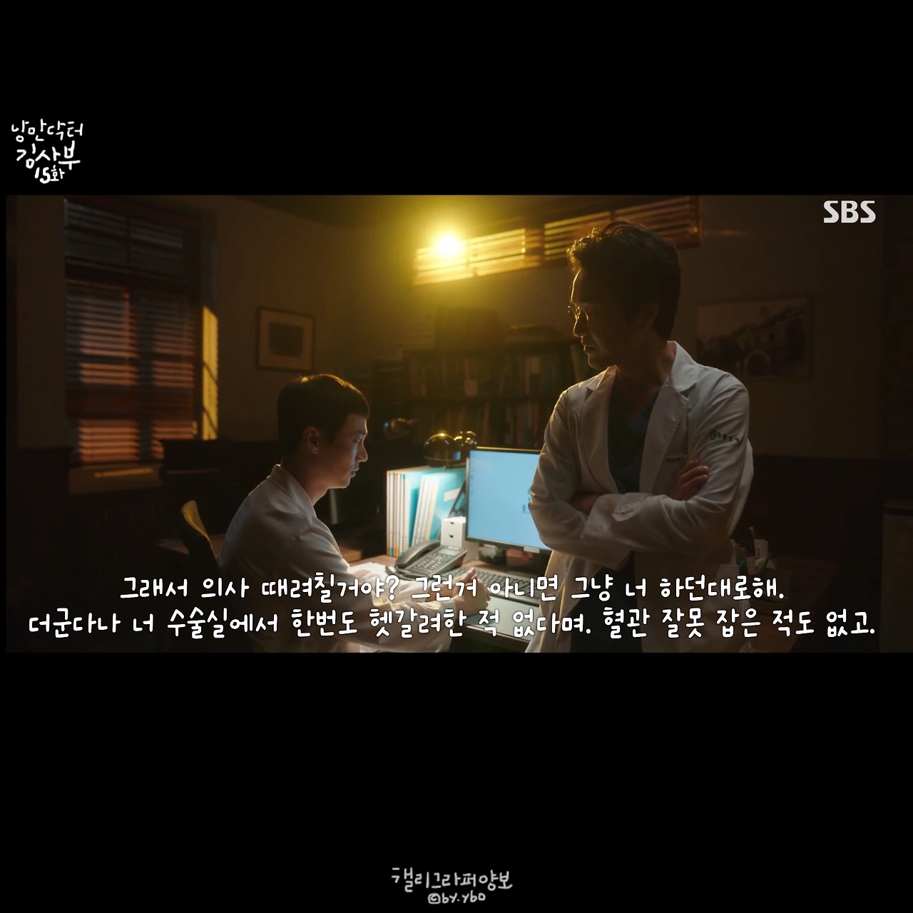 이선웅 선생은 낭닥 이번 시즌 나의 최애캐다. 열악한 해군 함정에서 환자를 포기하지 않던 돌담 팀이 보여준 의사로서의 사명감과 놀라울 정도의 수술 실력에 이선웅은 돌담에 지원한다. 저들과 같은 의사가 되고 싶은 꿈이 심겼다. 직접 마주한 선배들의 실력은 훨씬 뛰어났고 부담을 느낀 이선웅은 초반 본인의 실력보다 더 엉망인 솜씨를 보이고 만다. 그가 가진 약점이 그를 더 움츠러들게 했다.