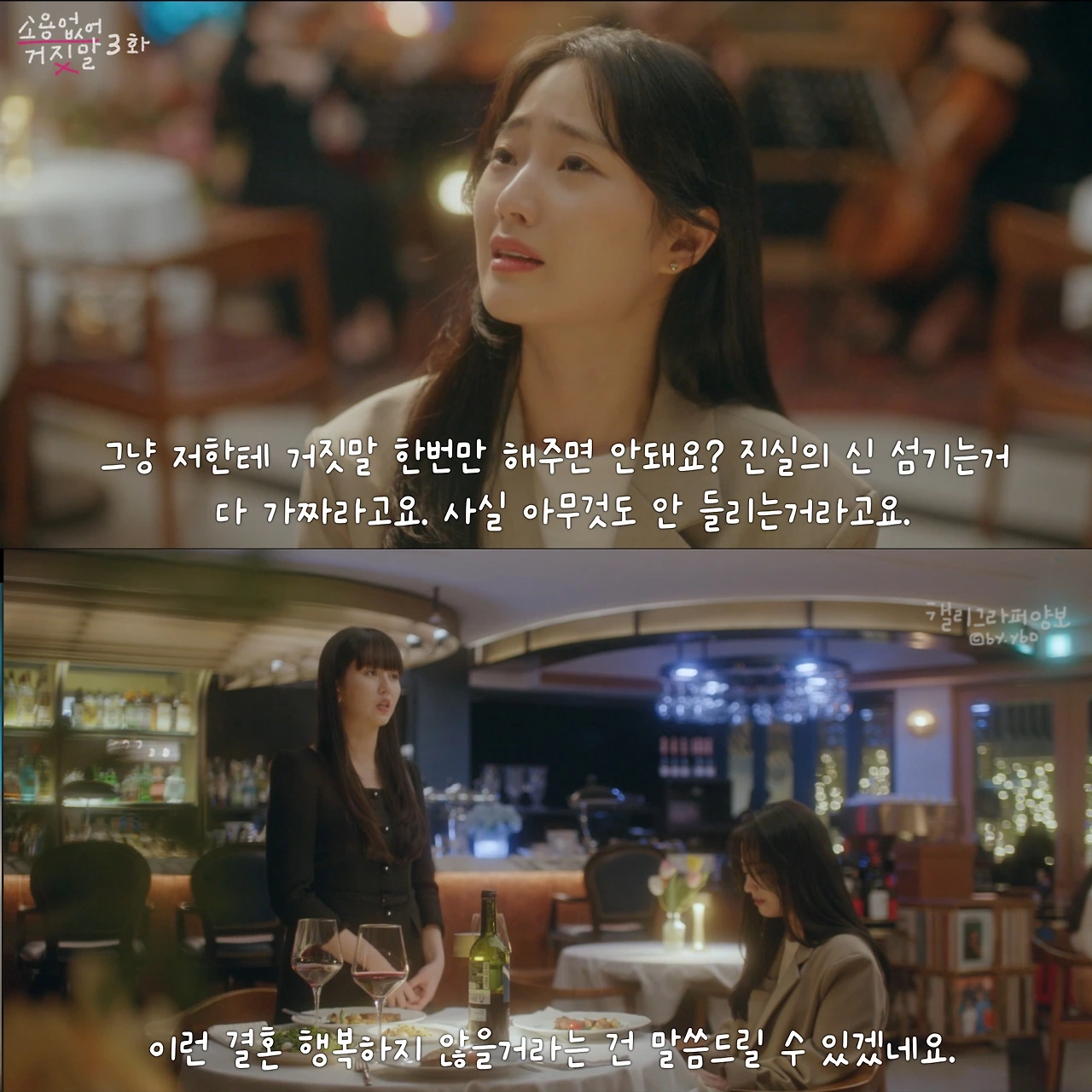 ‘진심’의 모양이 언제나 ‘진실’이지 않았다. 김밥 한 줄을 놓고 네가 먹는 것만 봐도 배부르다고 말하는 엄마와 자신은 이미 충분히 배부르니 엄마 먹으라는 딸의 대화는 전부 거짓말이지만, 당신을 사랑한다는 진심이 담겨있는 것처럼. 그렇기에 천 길 물속은 알아도 한 길 사람 속은 모른다는 말은 정말 맞다. 하지만 의뢰인과 솔희의 지난 상황에서 ‘믿음’을 선택하기란 생각만큼 쉽지 않다. 그렇지 않아도 세상은 믿는 도끼에 발 등 찍힌다는 말로 신뢰를 주는 일을 자주, 어리석은 행동이라 말하지 않은가. 그렇게 놓쳐버린 진심은 무엇일까? 말과 말 사이에 다 헤아리지 못한 숨은 마음이 얼마나 많을까?