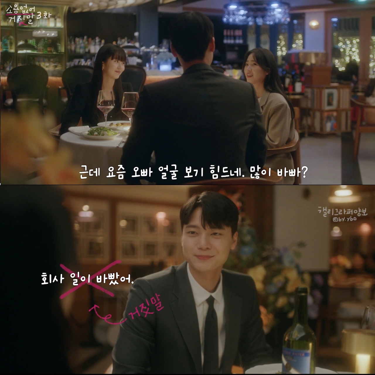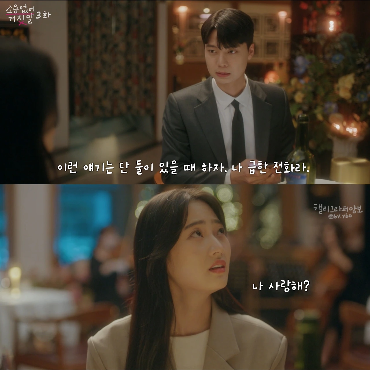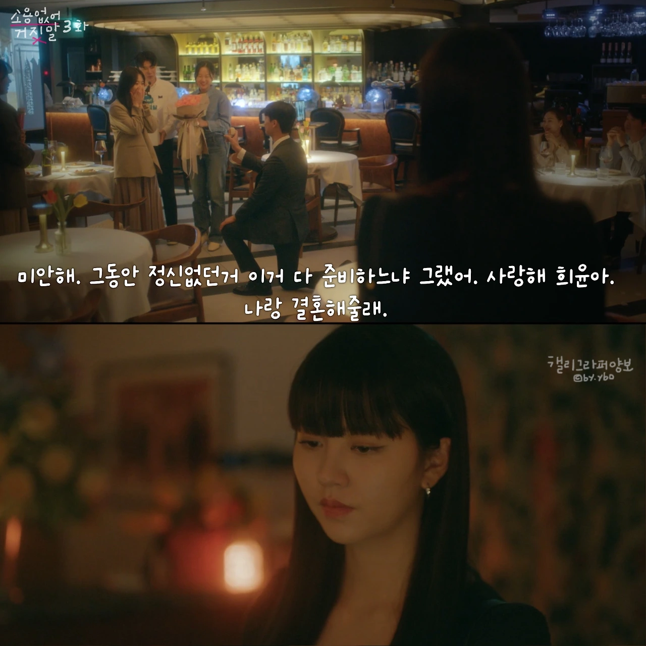 그렇게 자리를 떠나려는 순간, 레스토랑에 결혼행진곡이 퍼진다. 의뢰인의 친구들이 꽃다발과 풍성, 케이크를 가지고 줄지어 들어오고 맨 마지막엔 의뢰인의 남자친구가 수줍게 무릎을 꿇고 반지를 건넸다. 그가 바빴던 건 그의 말처럼 일 때문이 아니었고, 회사 단톡방과 연락을 하고 있던 것도 아니었다. 그의 말은 전부 거짓말이었다. 하지만 서프라이즈 프러포즈를 준비하기 위해 바빴고, 문 밖에서 등장할 타이밍을 기다리는 친구들과 연락을 하느냐 정신이 없었다. 그의 말은 거짓말이었지만 그의 마음은 진짜였다.