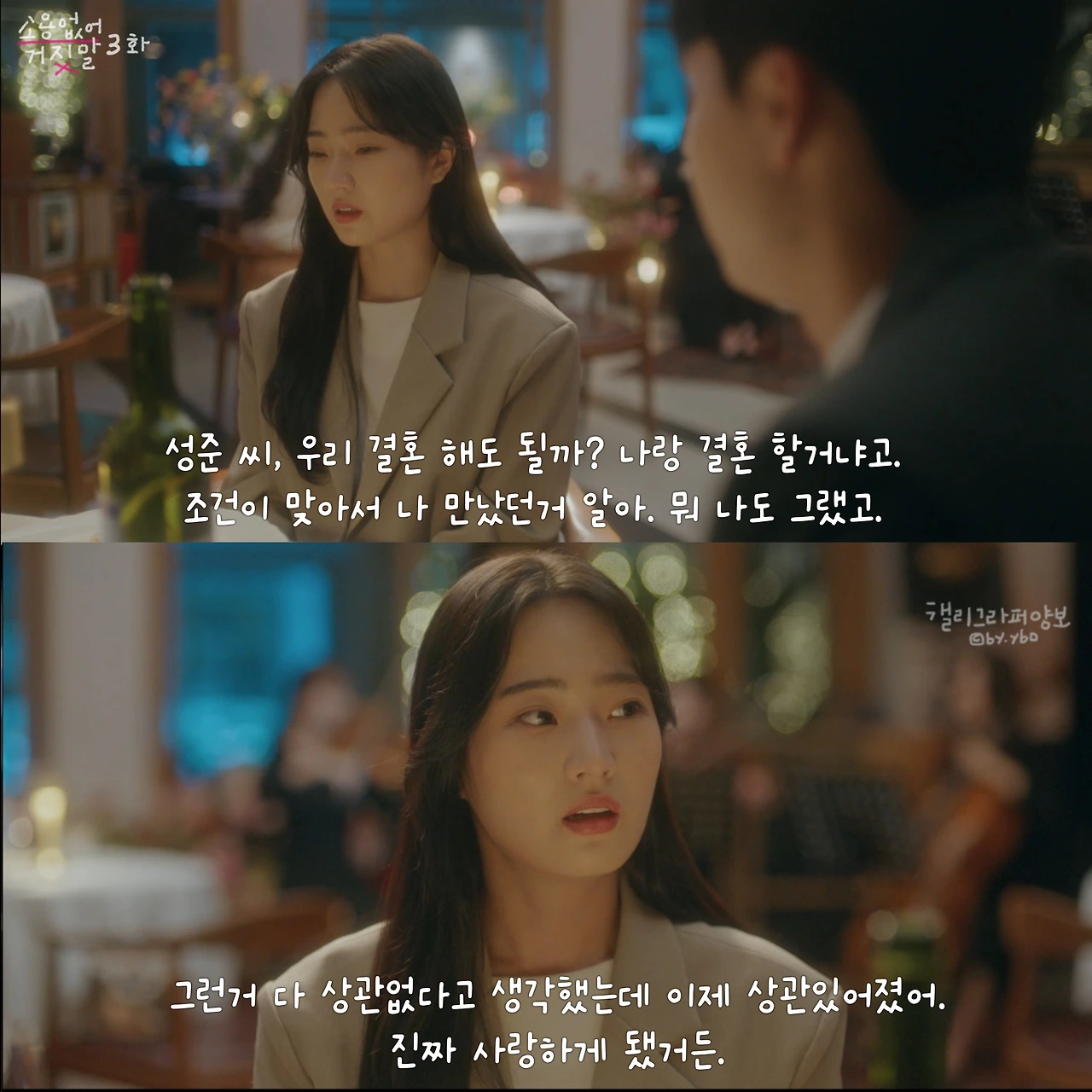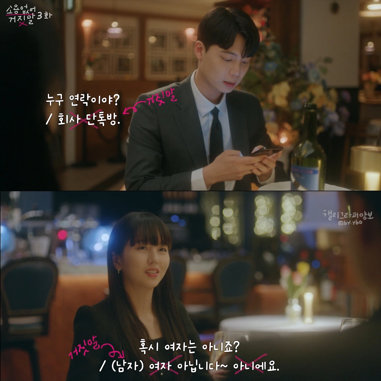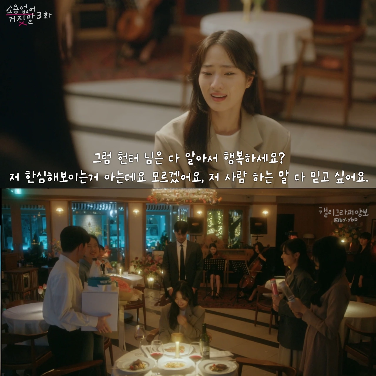 그렇게 자리를 떠나려는 순간, 레스토랑에 결혼행진곡이 퍼진다. 의뢰인의 친구들이 꽃다발과 풍성, 케이크를 가지고 줄지어 들어오고 맨 마지막엔 의뢰인의 남자친구가 수줍게 무릎을 꿇고 반지를 건넸다. 그가 바빴던 건 그의 말처럼 일 때문이 아니었고, 회사 단톡방과 연락을 하고 있던 것도 아니었다. 그의 말은 전부 거짓말이었다. 하지만 서프라이즈 프러포즈를 준비하기 위해 바빴고, 문 밖에서 등장할 타이밍을 기다리는 친구들과 연락을 하느냐 정신이 없었다. 그의 말은 거짓말이었지만 그의 마음은 진짜였다.