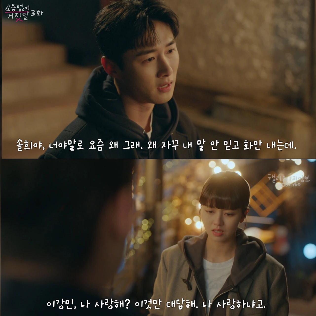 솔희(김소현 분)는 태어나면서부터 사람들의 말에서 거짓말을 구분하는 특별한 능력이 있었다. 드라마 <소용없어 거짓말>의 제목은 이러한 능력을 지닌 솔희를 설명하기도 한다. 처음 솔희의 능력을 접했을 땐 드라마에서 불필요한 오해를 없애는 ‘사이다’ 장치라고 생각했다. 가령 2화에는 남자 주인공인 도하(황민현 분)가 정황상 변태로 오해받는 장면이 나온다. 동네 주민들은 그 주변에 출몰하는 변태와 그의 차림이 비슷하다는 이유로 그를 변태로 확정시하고 있었지만, 솔희는 변태가 아니라는 도하의 말속에서 거짓의 소리가 들리지 않았기에 모두 앞에서 그가 변태가 아니라고 단언한다. 물론 솔희가 믿는 것과 사람들에게 사실을 확인시켜 주는 건 별개의 일이지만, 적어도 두 사람이 위기의 순간 괜한 오해로 서로를 믿지 못해 겪는 고구마 같은 시련은 없을 것 같았다. 하지만 이러한 생각은 단 1회 차만에 전환점을 맞는다.