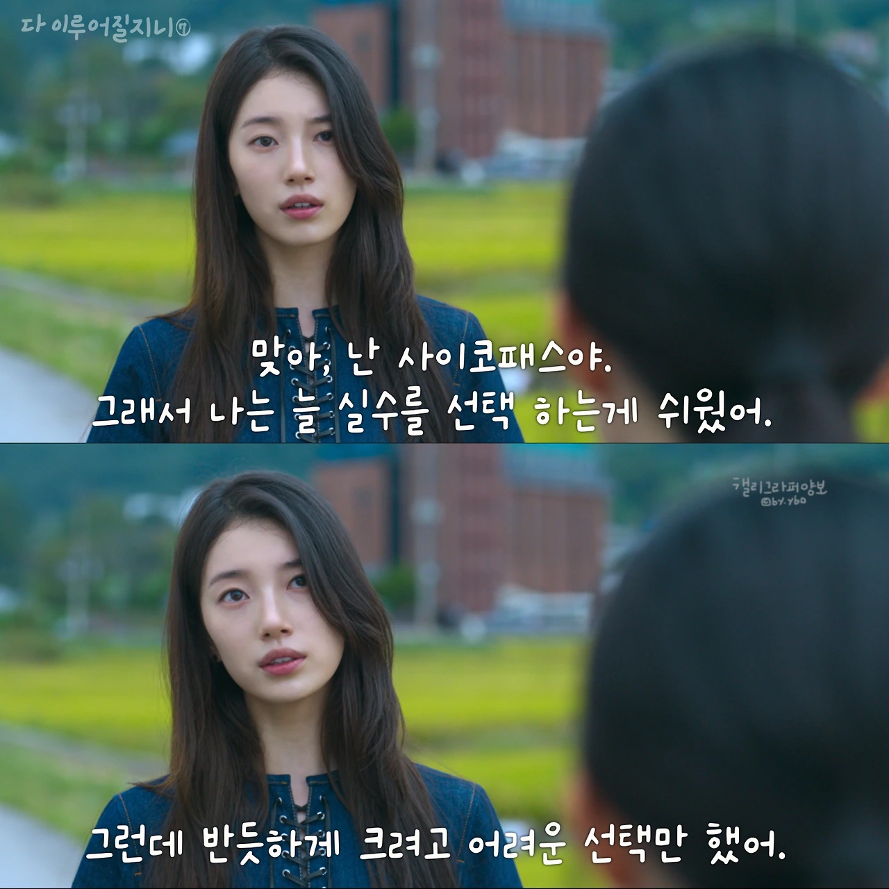 “난 사이코패스야. 그래서 난 나쁜 선택을 하는 게 쉬웠어. 그런데 반듯하게 크려고 어려운 선택만 했어. 그런데 너는? 사이코패스도 아닌데 대체 왜 그런 선택을 하는 건데?”(7화)