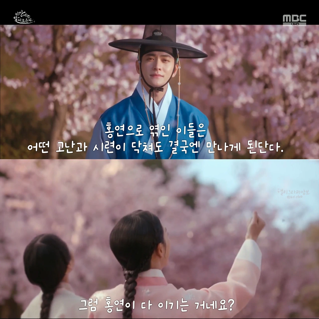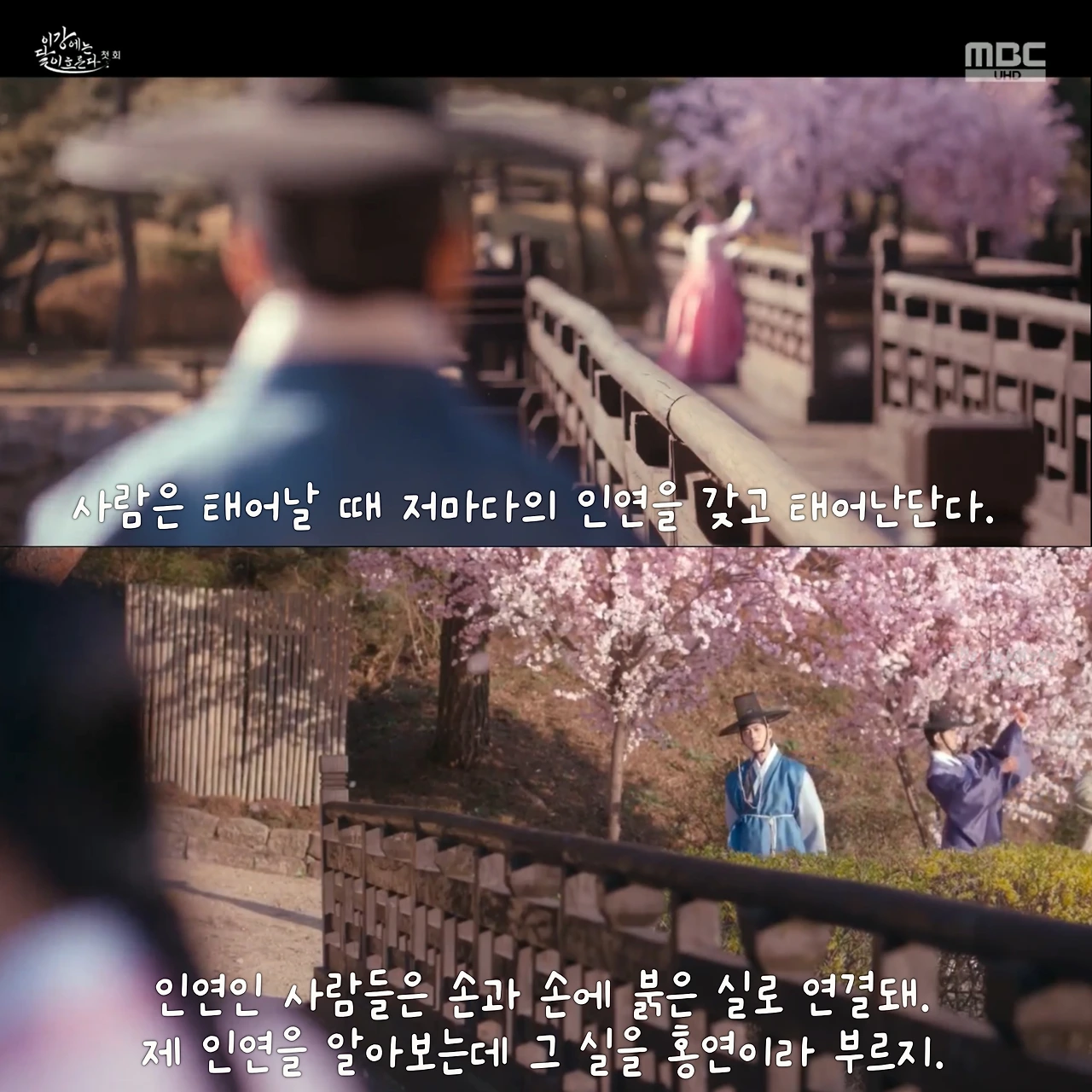 인연을 설명하는 ‘붉은 실’ 설화가 있다. 사람과 사람 사이를 이어주는 붉은 실은 제 인연을 알아보게 하는데, 이를 “홍연”이라 한다. 홍연으로 엮은 두 사람은 어떤 고난이나 시련이 닥쳐도 결국 만나게 된다. 이번 생이 아니면 그다음 생에서라도. MBC 드라마 <이 강에는 달이 흐른다>는 ‘인연’에 대한 이야기다.