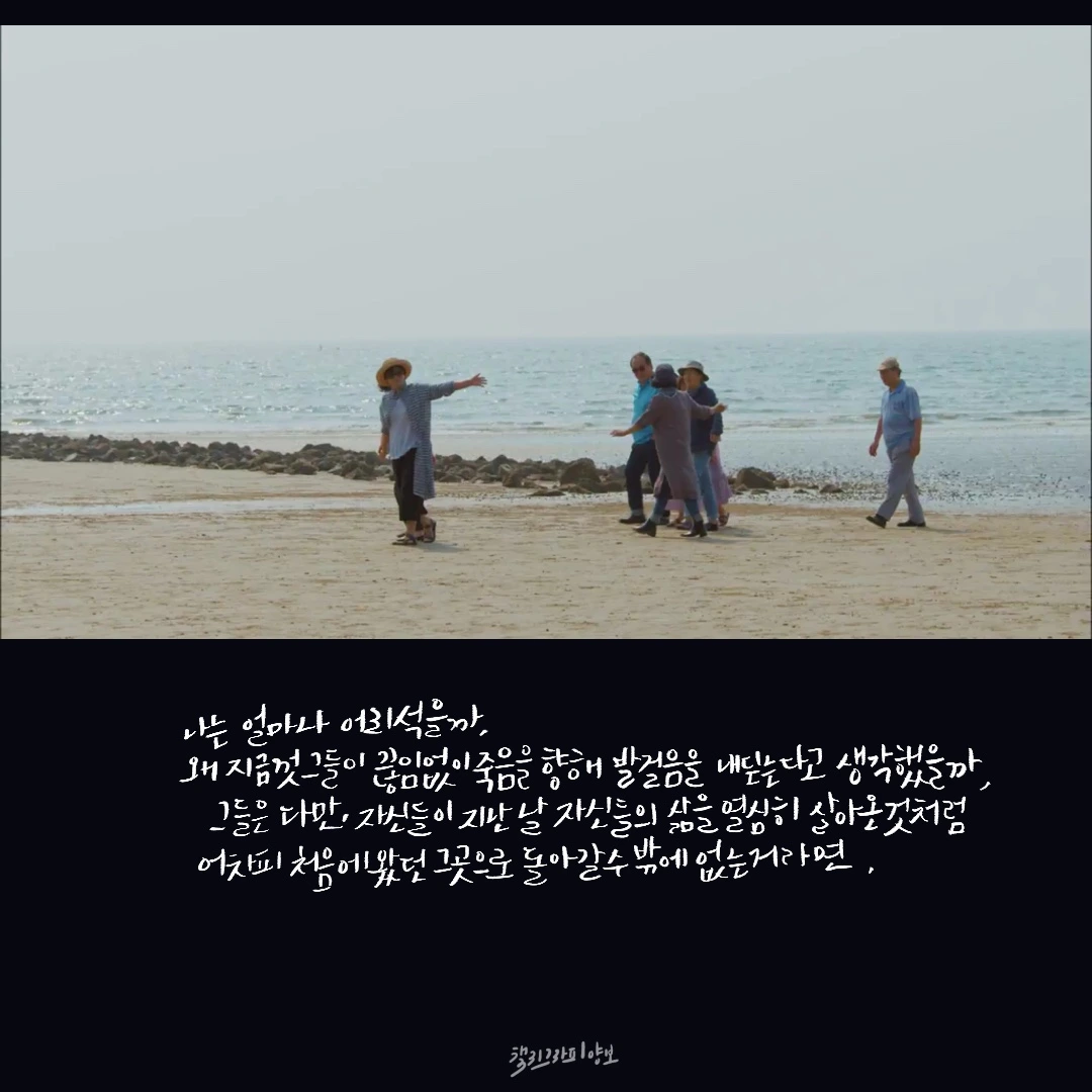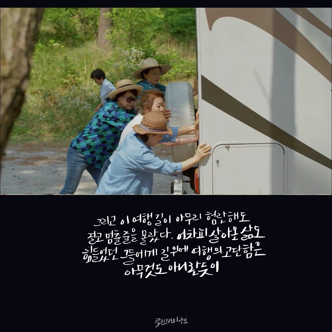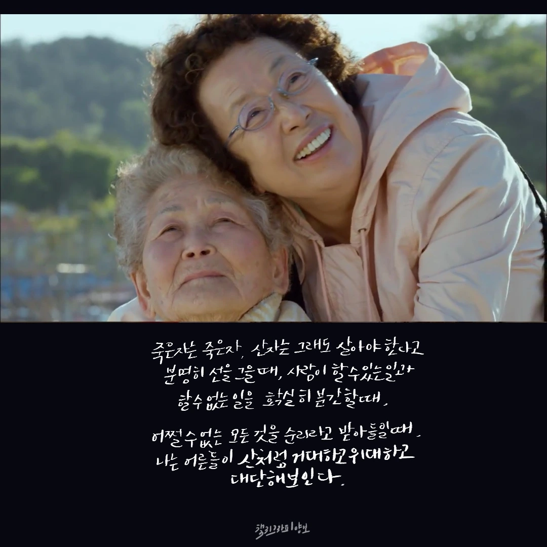 사실 우리 주변에 암이나 기타 병을 안고 살아가는 분들이 많다. 나의 엄마만 해도 그렇다. 모두 살아간다. 웃으며 울며 힘들어하지만 또 힘차게 살아가신다. "온갖 세상 일을 겪은 늙은 어른들이 거대하고 대단해 보이"는 이유며, 살아온 삶에 존경이 생기는 이유이기도 하다. 디마프에 나오는 늙은 어른들도 그렇게 살아간다. 그리고 그 나이에도 "길 위에서 죽겠노라" 꿈같은 이야기를 삶으로 옮긴다. 살아갈 남은 시간이 얼마나 소중한지 알기에, 함께 있는 사람들의 소중함을 누구보다 더 잘 알기에 행동에 거침이 없다.