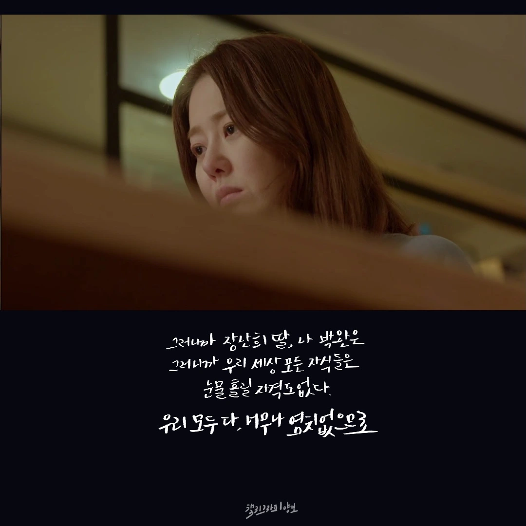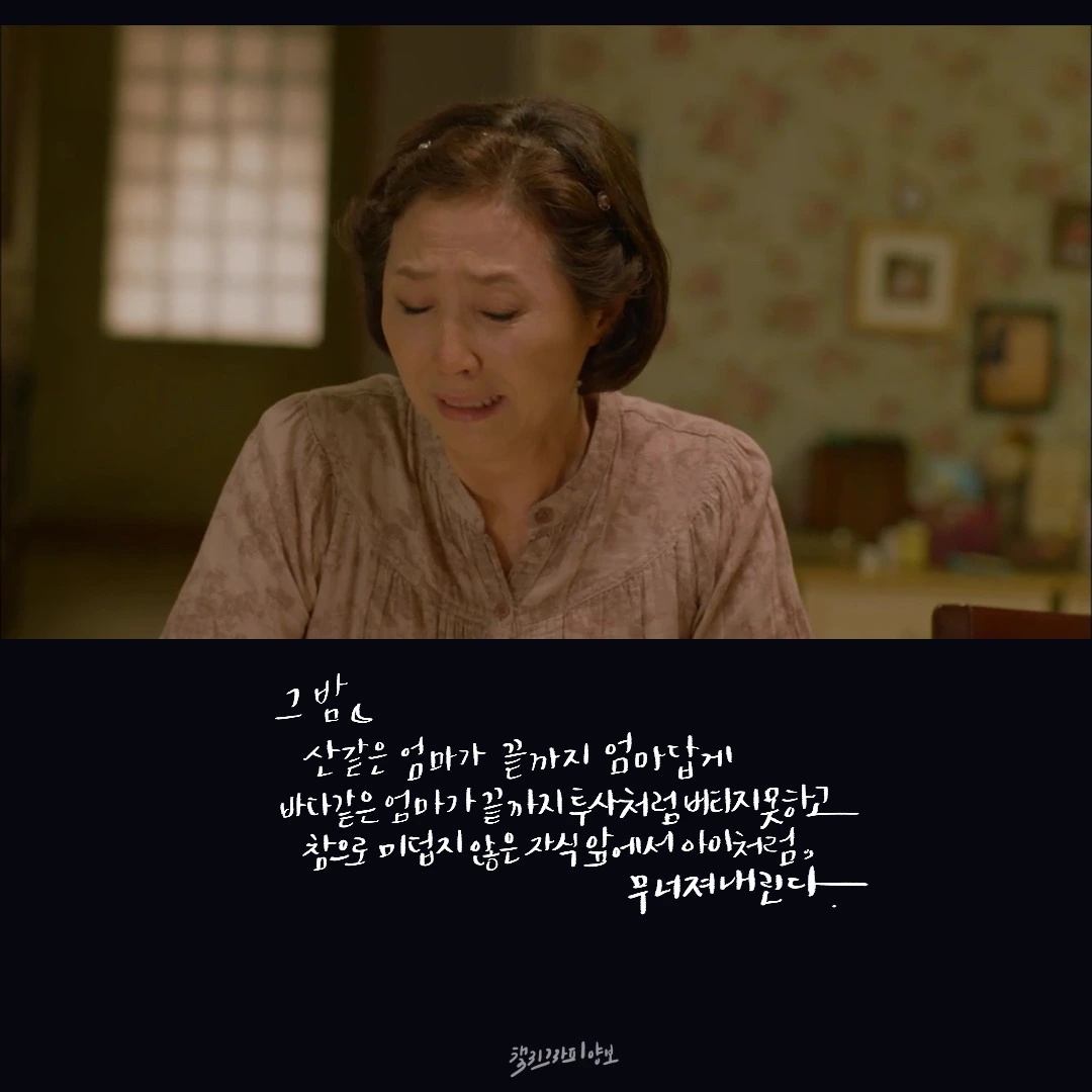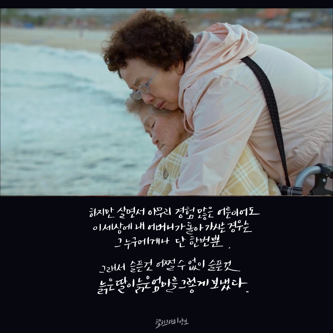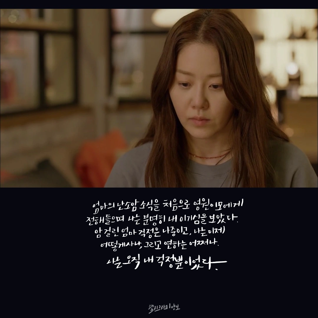 그랬기에 공중파 밖에 드라마를 모르던 나의 엄마는 tvn 채널을 외우고 드라마 시간을 벽에 써 놓으면서까지 이 드라마를 챙겨보셨다. 야한 장면이 나오는 것도 아닌데.. 난 엄마가 이 드라마를 시청하고 있으시면 조심스럽게 자리를 피했다. 너네가 딱 저렇다! 자식들은 죽어도 모를 거다! 공감을 바탕으로 한 잔소리가 쏟아지는 것도 있지만, 마음이 아파서... ... 자식 때문에 아퍼도 마음 편히 아플 수 없는 나의 엄마의 모습이 떠올라, 돌아가신 할머니를 생각하며 슬픈 눈에 눈물이 고인 나의 엄마를 보며 내가 우는 게 드라마 때문인지, 나의 엄마 때문인지 분간이 안돼서... 나는 드라마가 시작되면 그렇게 자리를 슬며시 피했다.