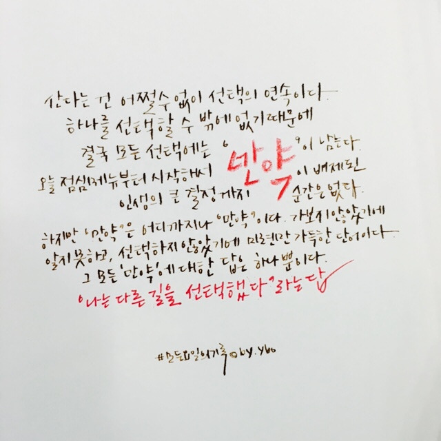 몇 주 뒤 우연한 기회에 동생과 비슷한 상황을 겪은 분을 만나 이야기를 하게 되었다. 젊은 감각의 여행 회사를 다니셨던 그분은 SNS에서 우연히 만났다. 나의 캘리를 좋게 봐주신 덕에 그분이 다니는 회사에서 준비한 기획에 손글씨로 참여했다. 그렇게 조금씩 친해져 우린 밥을 먹었다. 그때 그분은 여행 회사를 그만두고 일반 회사의 마케팅 부서로 이직했다는 소식을 전해왔다. 담당자가 바뀌어 대략 짐작한 일이다. 그런데 지금 그분의 상황이 동생과 매우 비슷했다. 자유로운 회사에 있다가 체계적인 시스템에서 일해보고 싶어 들어간 회사였는데, 너무 갑갑해서 힘든 부분이 있다며 그만두고 싶은데 이직이 너무 잦아서 경력 관리를 생각하면 주저하게 된다는 이야기가 덧붙어 나왔다.