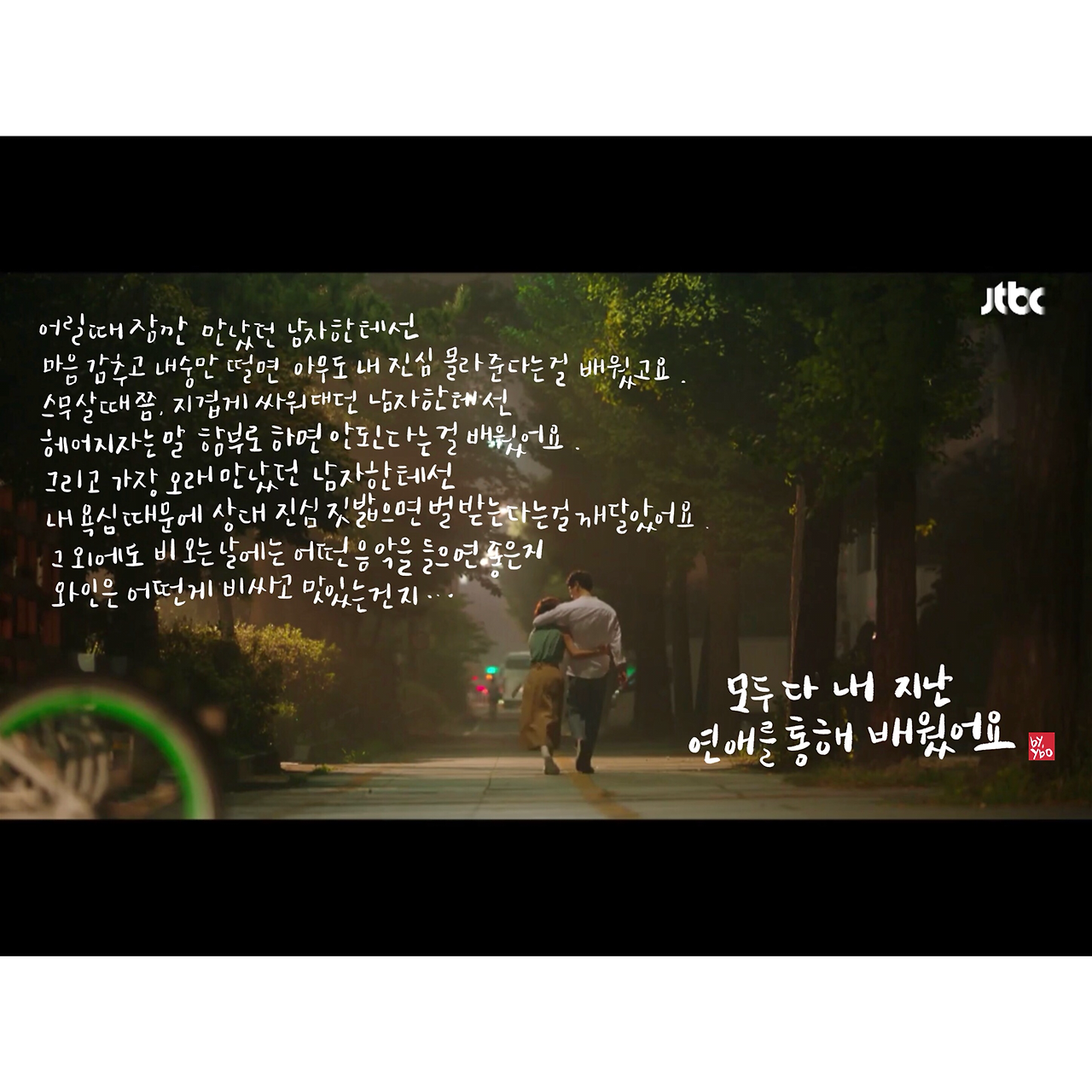 어릴때 잠깐 만났던 남자한테선 마음 감추고 내숭만 떨면 아무도 내 진심 몰라준다는걸 배웠고요 스물살쯤 지겹게 싸워댔던 남자한테선 헤어지자는 말 함부로 하면 안된다는걸 배웠어요. 그리고 가장 오래 만났던 남자한테선 내 욕심때문에 상대 진심 짓밞으면 벌 받는다는걸 깨달았어요. 그 외에도 비 오는 날에는 어떤 음악을 들으면 좋은건지 와인은 어떤게 비싸고 맛있는건지 ... ... 다 모두 다 내 지난 연애를 통해 배웠어요.