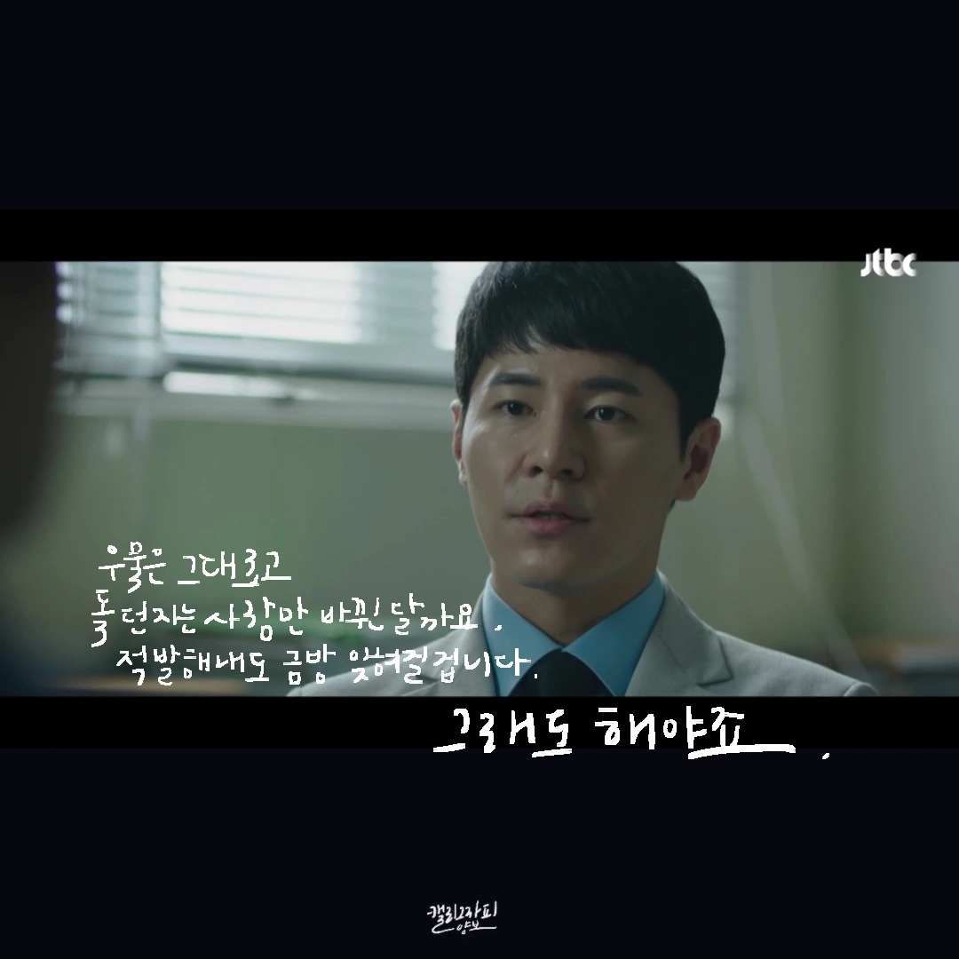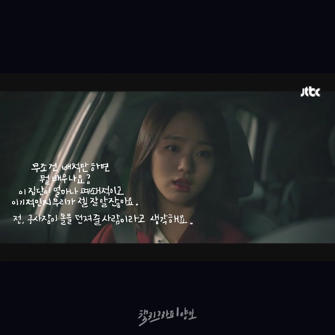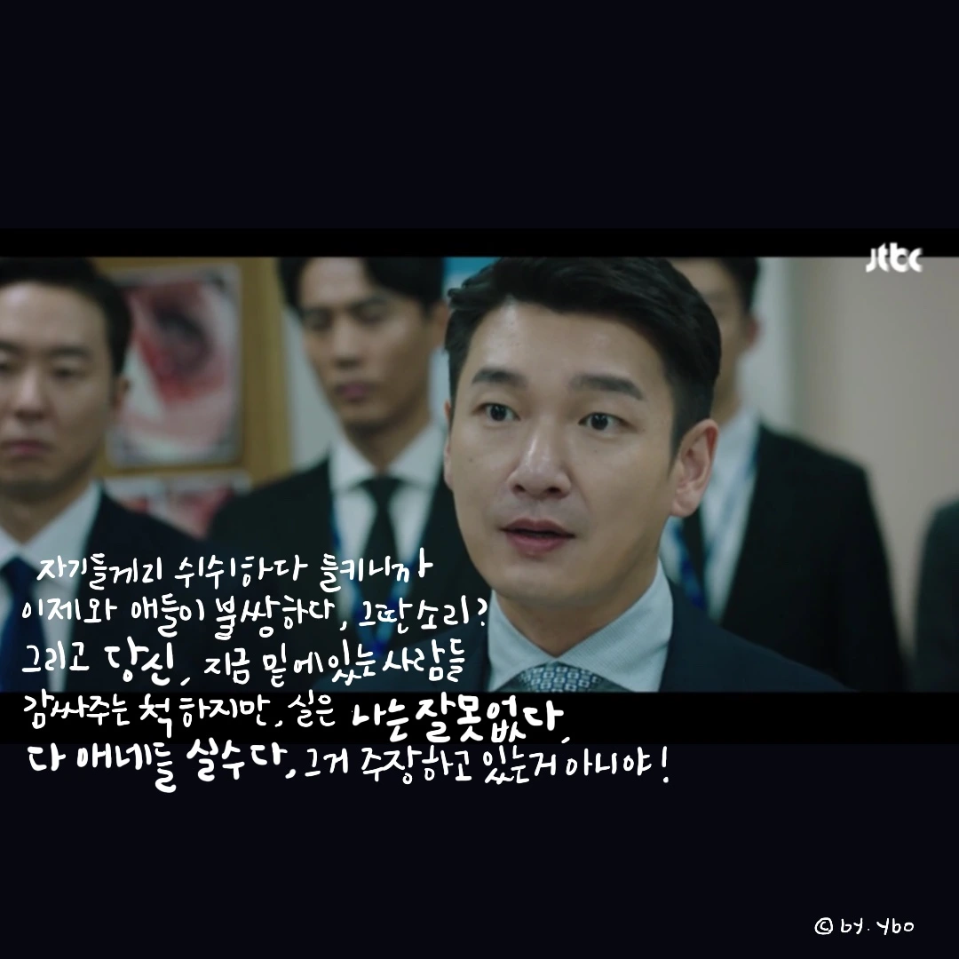이수연 작가님의 작품에 대해 내가 감히 뭐라 말할 수는 없다. 하지만 작가님의 작품을 기다린 마음을 말하자면, 작가님은 같은 소재도 다르게 나타낸다. 그건 당연히 조직의 시스템에 대한 철저한 조사도 있었겠지만, 그 조직을 파헤치듯 사람의 이면도 함께 파헤치기 때문인 듯싶다. 드라마를 보며 인물을 이해하다가도 원망하게 되고 미워하다가도 안쓰러워하게 된다. 이러한 복잡한 감정 없이 그저 사건만을 본다면 놓쳐지는 본질적인 것들을 생각하게 한다. 예를 들어 나쁜 행동인걸 알지만 왜 그러한 행동을 했는지, 그 이유를 알아야 한다고 생각한다. 그저 잘못한 사람을 해당 자리에서 물러나게 하는 것만으로는 상황이 개선되지 않는다. 아무리 정의로운 사람이라도 그 자리에 들어가서 같은 잘못을 하지 않을 거란 보장이 없다. 만약 흔들리지 않았다면 그러할 수 있었던 이유도 우린 알아야 한다. 사람과 시스템 모두, 뿌리를 찾아야 본질적인 나아짐이 있지 않을까?