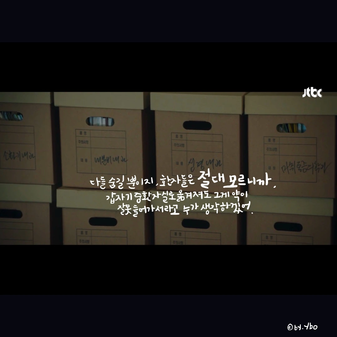 구승효, 예진우 이 곳에 나오는 사람들 모두 우리와 같은 사람이다. 어떤 일이 일어나고 반응할 때 각 자의 삶에서 경험했던 일이 영향을 끼친다. 아버지를 일찍 잃음에서 나온 책임감이 예 선생을 병원을 너머 인간의 본질까지 생각하게 했고, 생명의 숭고함이 더한 병원이란 곳에서 구 사장도 많이 배웠고 스스로 변해갔다. 우왕좌왕하던 의사들도 오랜 시간이 걸릴지라도 저지시키고 버틸 힘을 기르는 변화를 계획하게 되었다.
