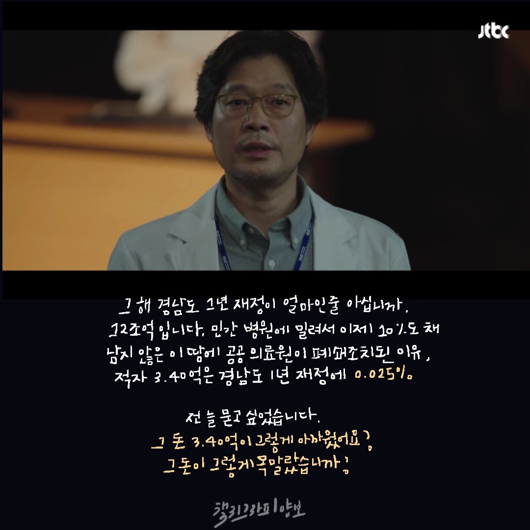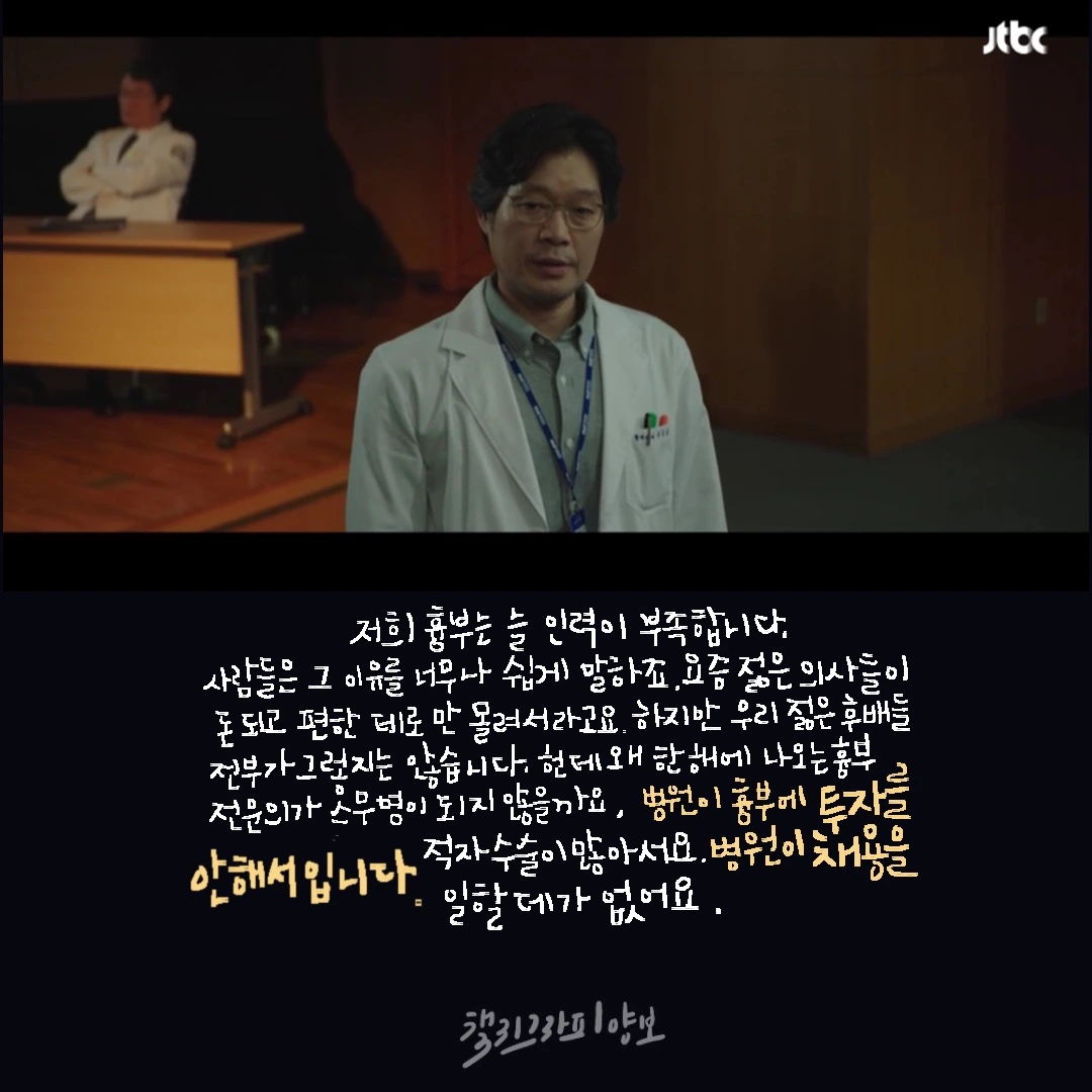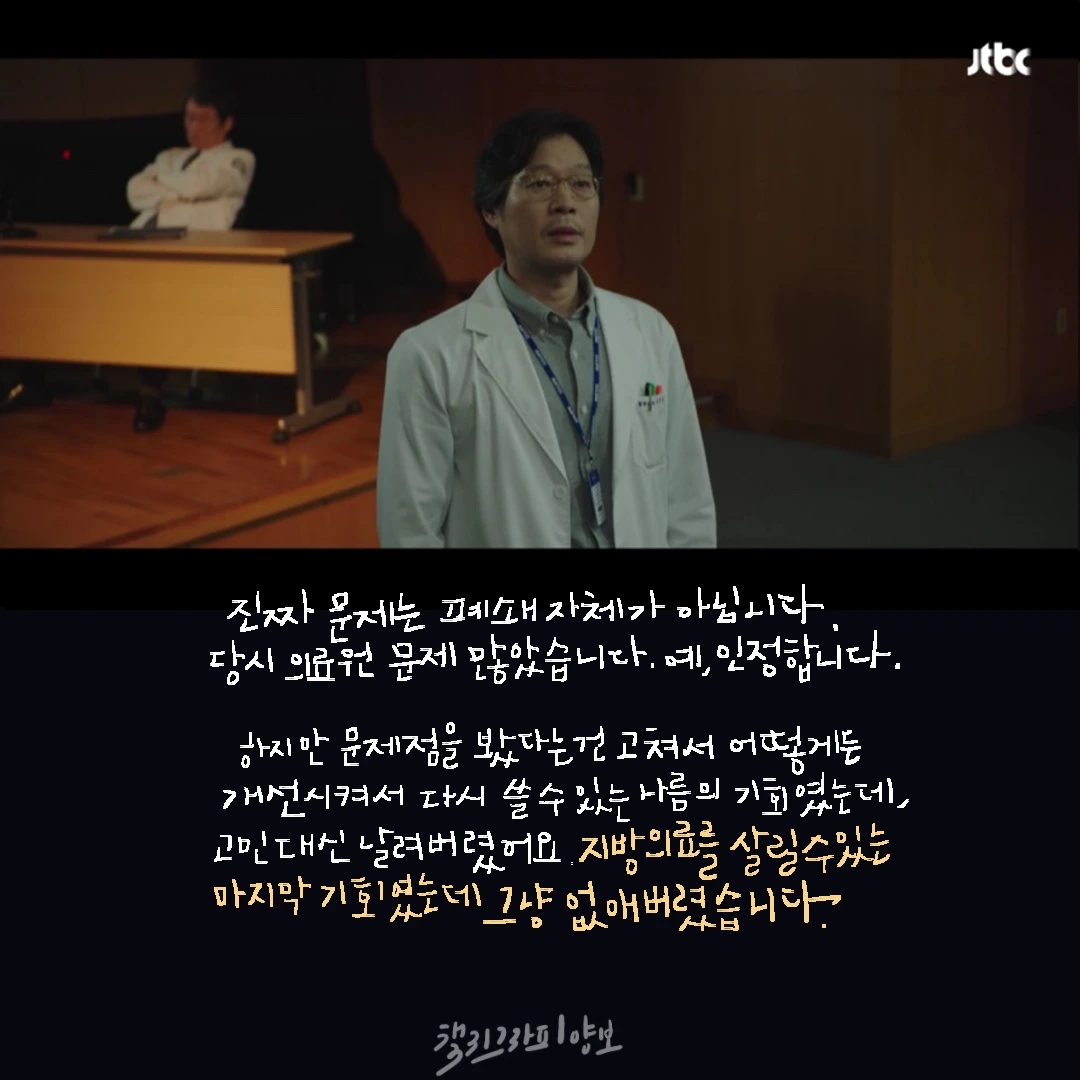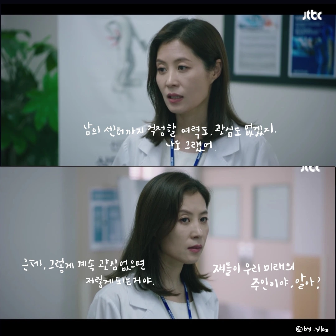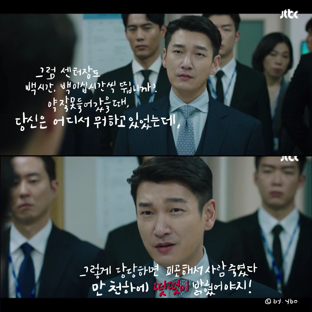 그리고 나는 이 이야기가 공감가지 않는 그들만의 이야기라고도 말할 수 없었다. 언뜻 보기에는 병원에서의 권력을 다투는 듯 하지만 이 드라마에서는 병원 진료의 실태, 의료계 종사자들의 업무 과중과 그 배경, 거대 자본과 결탁, 의료민영화 그것이 의미하는 것 등에 대해 잔인하다 느껴질 정도로 현실성 있게 이야기했다. 평생을 사면서 법정에 서지 않은 사람은 있으나 병원에 가지 않은 사람은 없을 것이다. 그렇다면 이 드라마는 우리 모두에게 미치는 이야기가 된다.