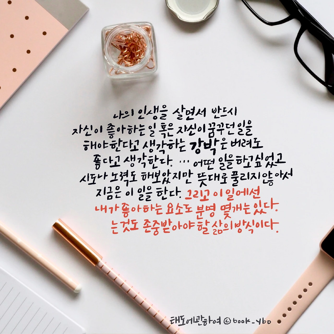 작가의 말처럼 나는 하고 싶던 일을 내려놨다. 그저 곁에 두자 자연스러운 행위로 찾아왔다. 취미가 되었다. 여전히 내 글 솜씨는 미비하지만 생각을 나누는 글 쓰기는 여러 방면으로 넓어졌다. 글을 쓰며 좋은 글귀를 따라 쓰던 행동은 캘리그래피(나는 손글씨라는 표현을 더 선호한다만)라는 또 하나의 활동이 되었고, 이러한 활동들을 인연으로 원데이 클래스를 기획하며 지금은 작업 공간을 갖고 싶다는 꿈을 꾸고 있다.