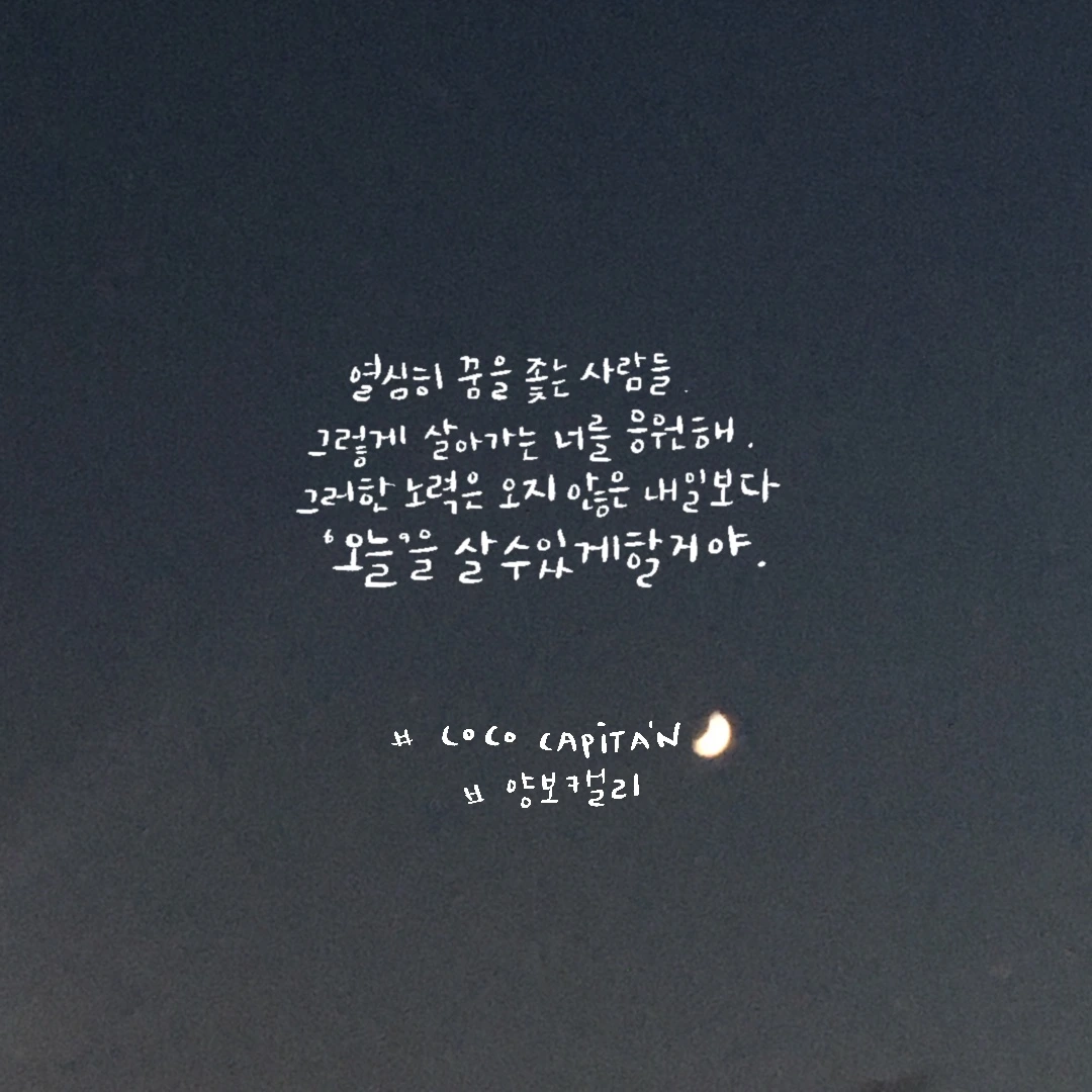 "스스로를 안아준다는 건 어렵죠. 주변을 챙기다 보면 자신을 안아 줄 힘이 남아 있지 않기도 하고, 자신의 실수를 자신에게만은 감추기 너무 어렵죠. 그럴 땐 곁에 있는 좋은 사람들에게 위로를 받아보세요. 약하다고 생각할 사람 아무도 없더라고요. 부디 오늘 위안이 되는 밤이 되시길. 오늘 하루 참 수고 많았습니다."