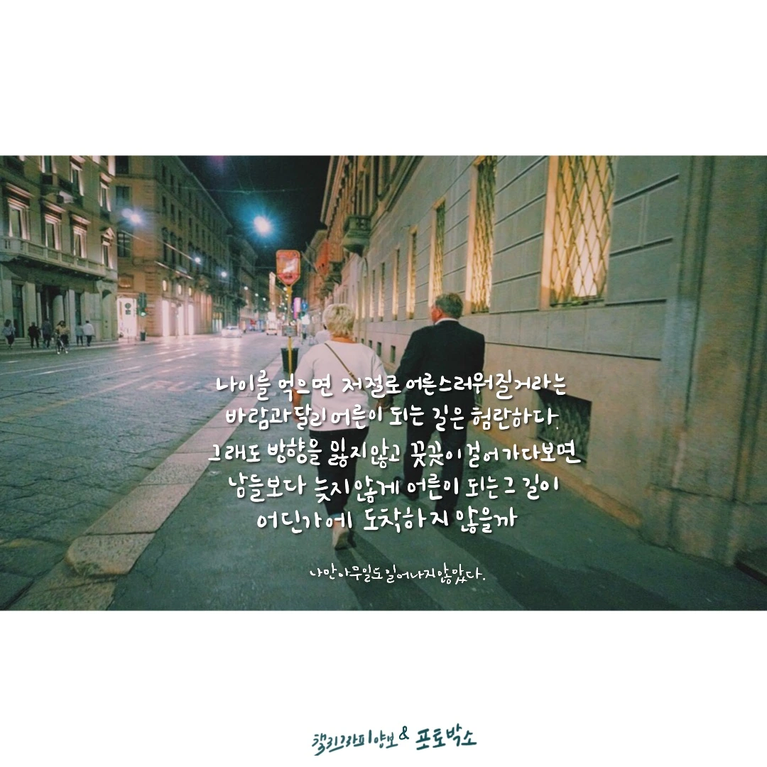 하지만 그럴 때면 주문처럼 ‘언제는 내가 잘했다고!’를 생각하려고 한다. 애시 당초 나는 완벽한 사람이 아니었으니 완벽해지려고 애쓰기 보단 좀 더 좋은 사람으로 늙고 싶다. ‘좀 더 좋은 사람’이란 말이 갖는 의미가 완벽하고 흠이 없는 결과물을 만드는 사람이 아니라는 걸 이젠 아니까.