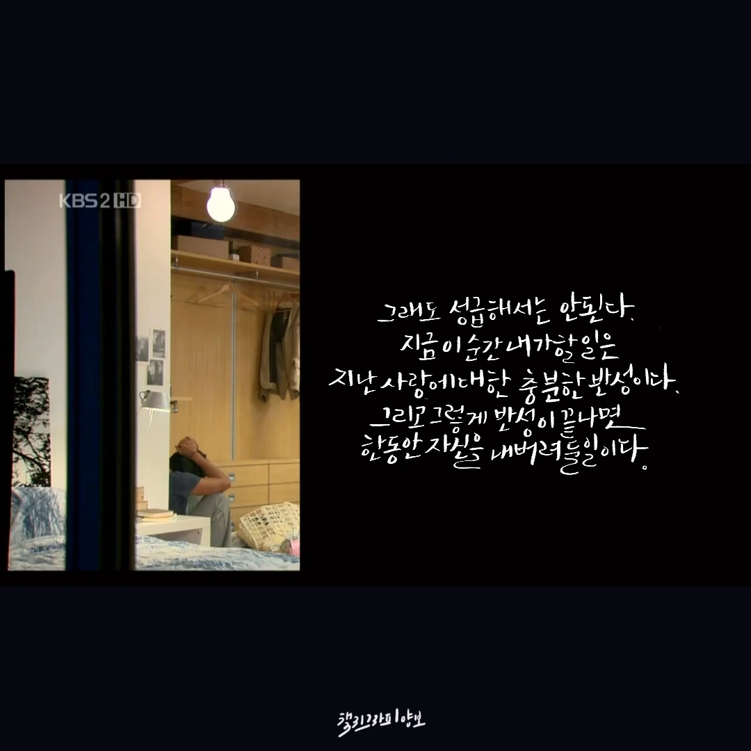 결론을 다 아는 드라마를 다시 보면서 당시에는 스쳐 지나갔던 대사와 내레이션이 지금은 하나도 놓쳐지지 않는다는 걸 알았다. 대본집으로 보는 것보다 손으로 써서 옮길 때 느껴지는 감정이 다르다. 그래서 나는 내가 느낀 대사와 내레이션을 가능한 전부 손글씨로 옮겨놓고 싶은데, 솔직히 너무 많다. 그래도 기쁘다. 마치 준영이가 내 나이만큼 자라 친구가 된 것 같기도 하고:) 나중에 보면 또 어떤 기분이 들까? 벌써 궁금해진다.