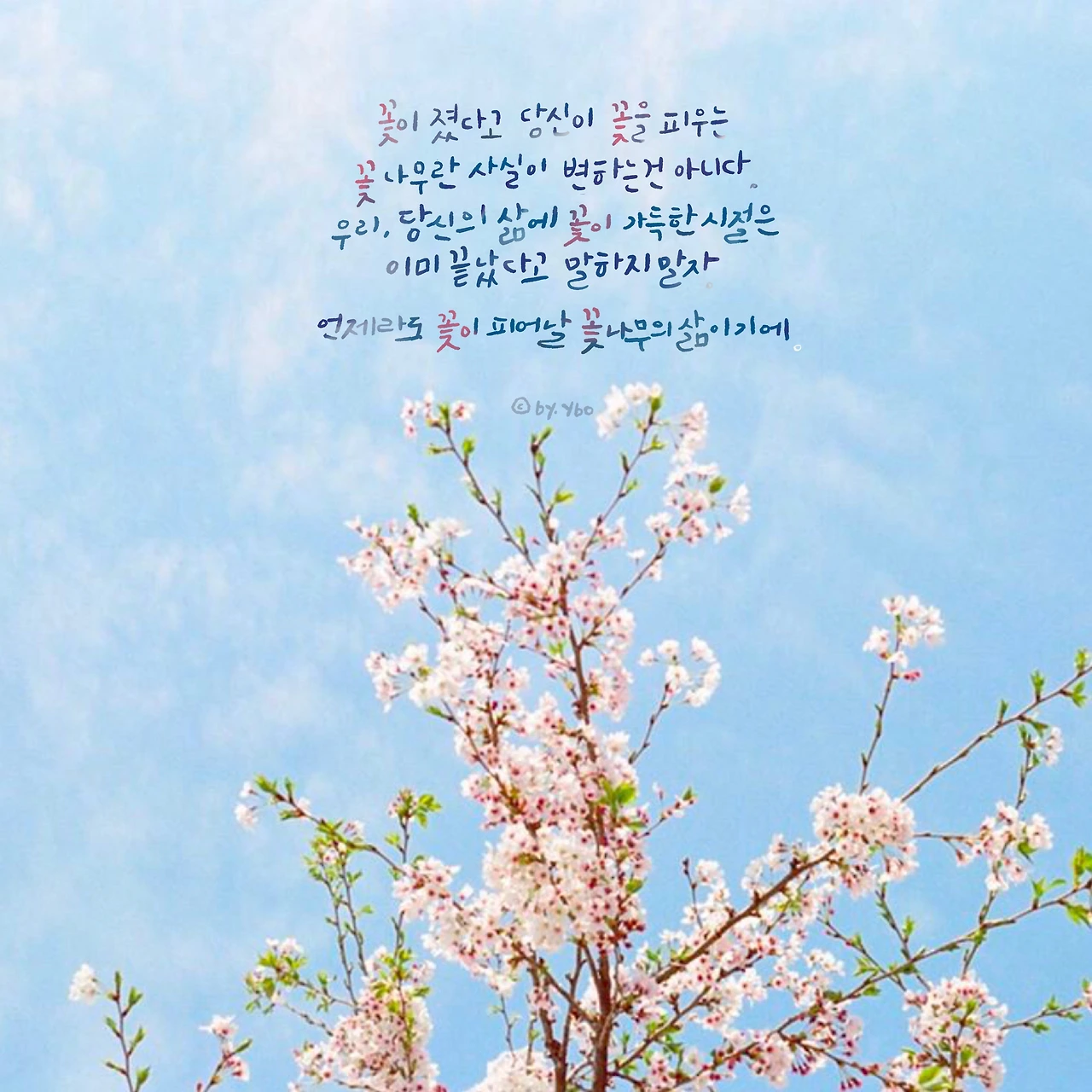 꽃이 졌다고 당신이 꽃을 피우는 꽃 나무란 사실이 변하는 건 아니다. 볼거리가 이젠 없다고, 아름다운 시절은 다 지났다고 말 하지만 지금 가진 푸른 잎은 한 가득 꽃을 피어낸 나무만이 가질 수 있다. 그리고 꽃나무는 다음 해에 다시 꽃을 피운다. 우리, 당신의 삶에 꽃이 가득한 시절은 이미 끝났다고 말하지 말자. 지금 푸른 아름다움도 쉬이 가질 수 없는 아름다운 때이며, 꽃은 생에 한번만 피우는 나무는 없으니까.