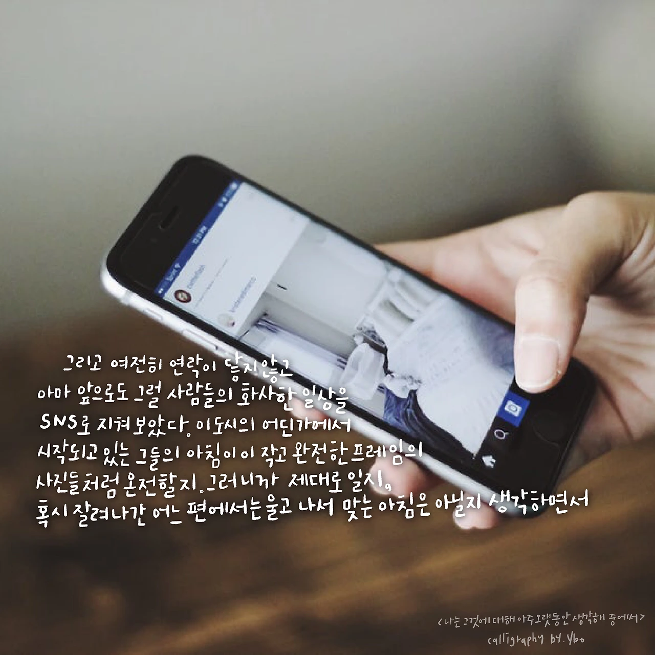 소통을 말하지만 우린 피드 안에 머물 뿐, 가까이 있는 사람의 마음조차 헤아리지 못한다. 상대방의 액정에서 내 글은 얼마만큼 생명력 있게 전달될까? '좋아요'가 눌린 수만큼 내 글이 읽혔다고 믿어도 되는 것일까? 나조차 긴 길은 빠르게 내리면서 두 번의 터치로 좋아요를 누르면서도 이런 기대를 한다.