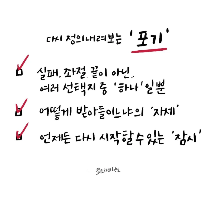 이제 내게 포기란 실패, 좌절, 끝이 아닌 여러 선택지들 중 하나가 되었다. 어떻게 받아들이느냐의 '자세'이고, 언제든 다시 시작할 수 있는 '잠시'가 되었다. 덕분에 무언가를 하다 멈춰도 크게 무너지지 않을 수 있게 되었다. 되려 삶이 좀 더 윤택해졌다. 실패자가 될 경우가 사라졌으므로.
