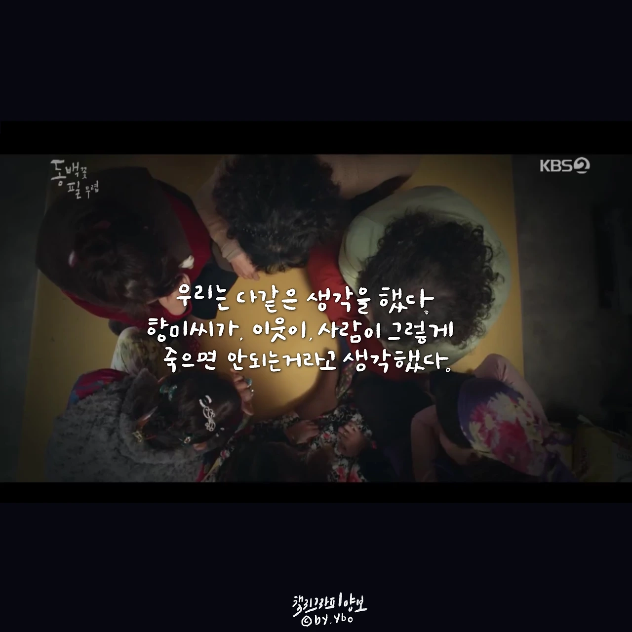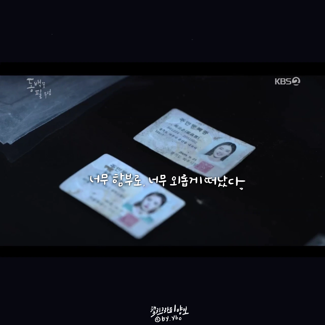 고운이란 이름의 주민등록증 속 사진은 환하게 웃고 있다. 그냥 그 이름으로 살지, 그랬으면 고운 날을 맞이했을 것 같아... 고운의 삶도, 향미의 삶도 함부로, 외롭게 떠났다. 그래도 울어주는 동백이로 인해 가는 길은 덜 외로웠길.