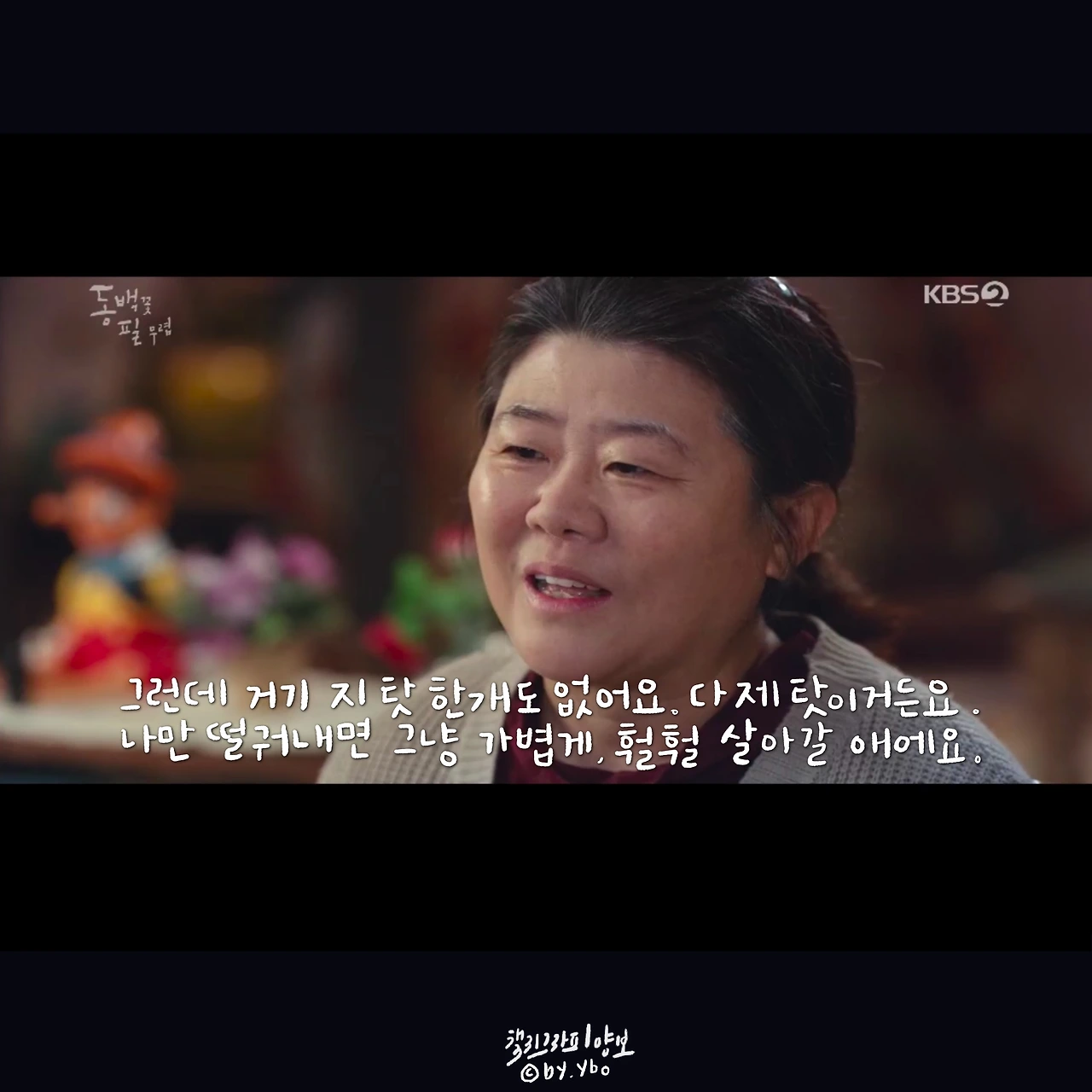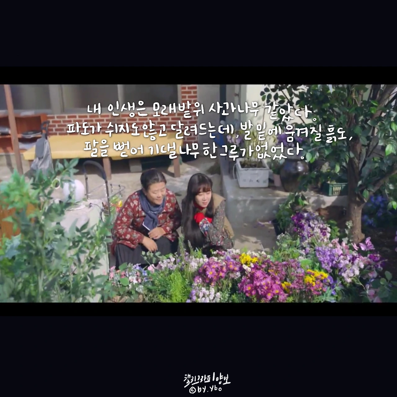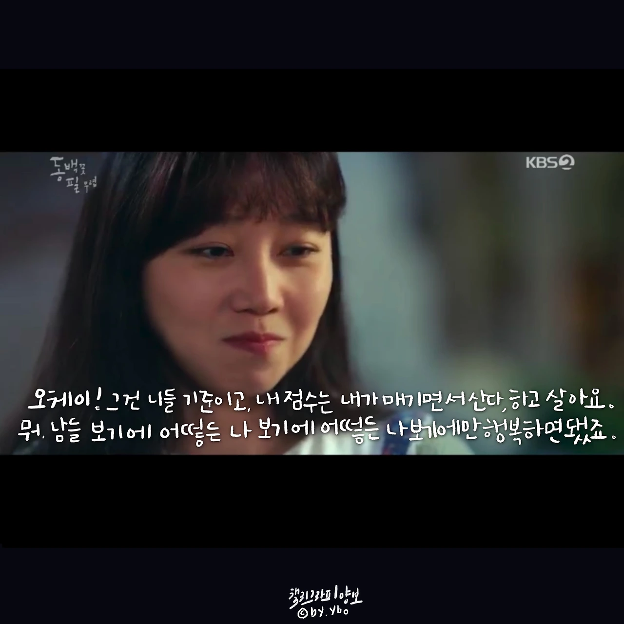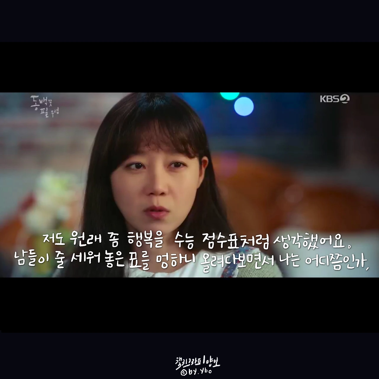 그렇다. 각 자의 삶이고 우린 함부로 타인의 삶에 대해 말할 수 없다. 다만 자신이 부족함을 자영 언니처럼 인정하고, 동백이 처럼 자신의 행복을 찾아가고 싶을 뿐이다. 누군가에게 내 인생을 맡기지 않으려고 하는 책임감을 행복에도 적용하고 싶다. 내 행복도 다른 누군가가 주는 것이 아닌, 내가 책임질 영역이고, 내가 인정해줘야 할 부분 아닐까?