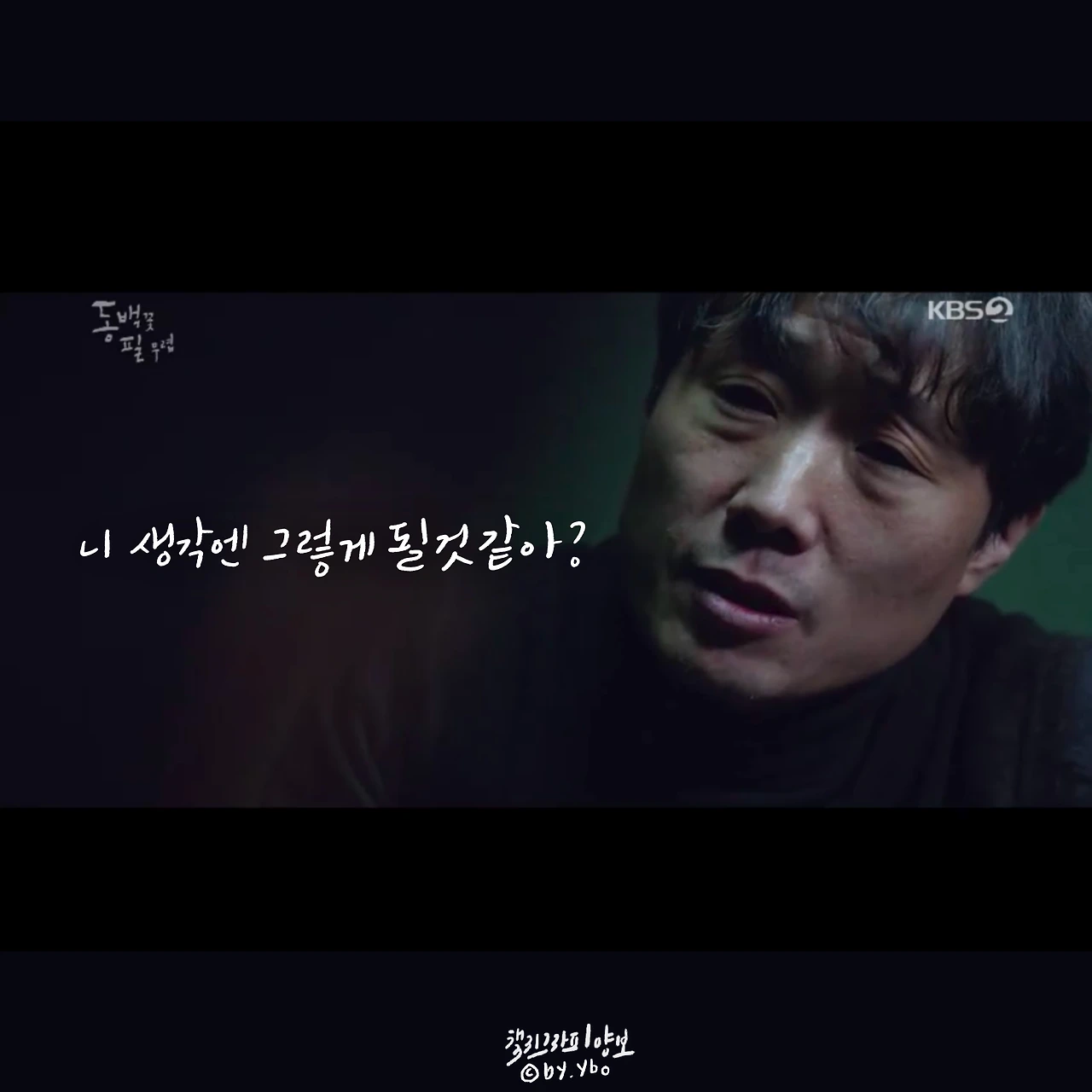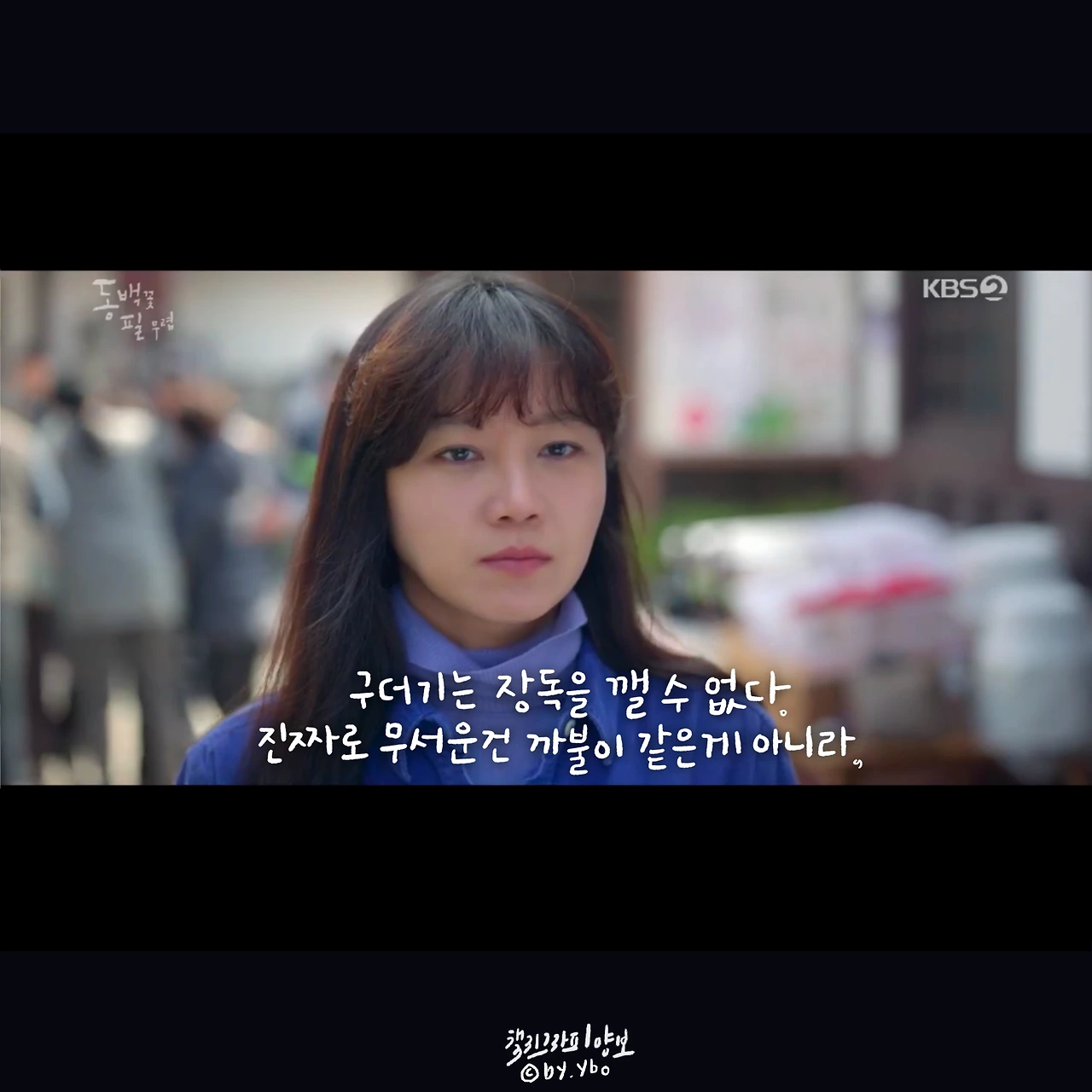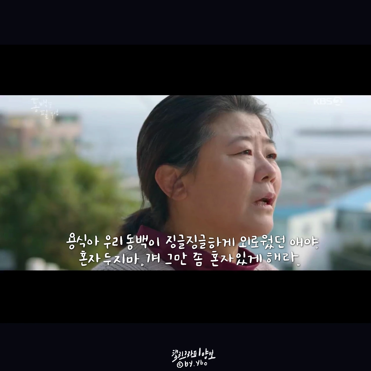 용식이는 항상 동백이를 지켜주었다. 지켜봤고 응원해주고 필요할 때 곁에 있어주었다. 그의 행동엔 존중함이 있었다. 내가 지켜줘야 할 연약한 존재의 여자가 아니라 자기 옆에 서서 나란히 함께 가는 동백이. 그녀의 삶을 존중하며 그녀 곁에 있었다. 그런 그의 인정함이 너무 좋다.