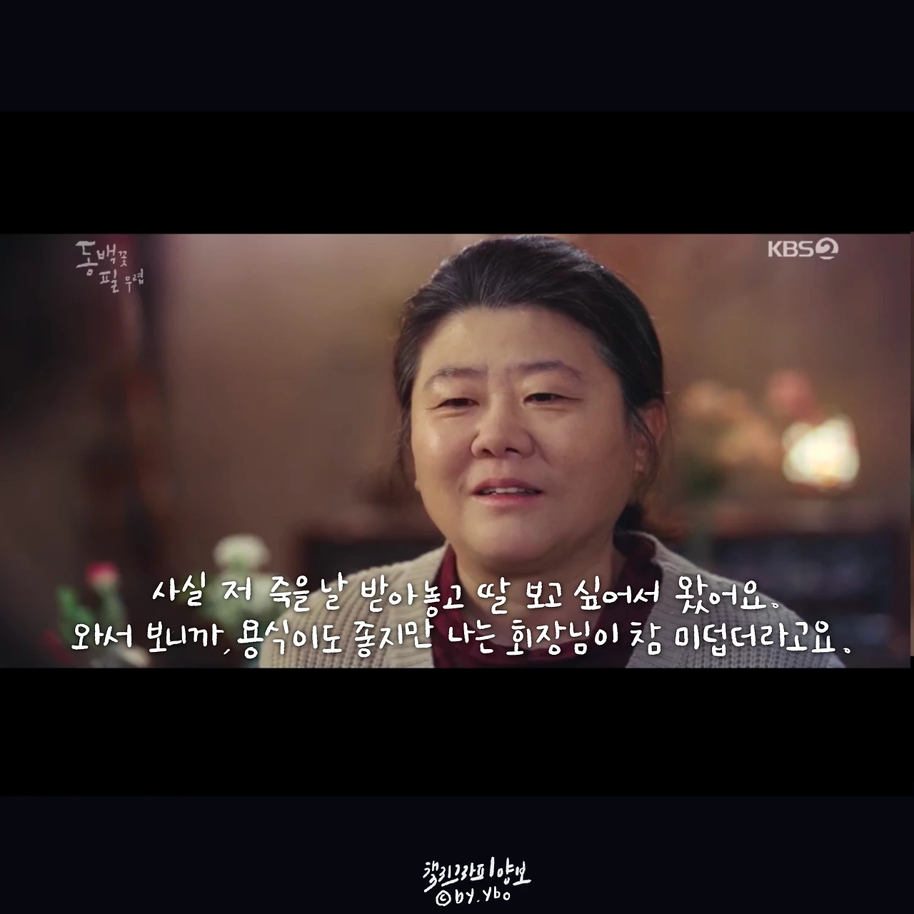 회장님이 동백이의 공짜 엄마가 되어주었다. 동백이에게 가장 필요한 게 뭔지 아는 엄마. 따스한 시선으로 그녀를 귀하게, 귀하게만 받겠다는 말에 너도 너도 울었을 것이다. 어쩌면 우리 회장님도 긴 긴 시간 누군가에게 그렇게 품어졌길 바라진 않았을까? 결국 자식이 부모를 이긴다. 다 알고, 못 하는 것 없는 엄마가 늘 진다. 맥없이 백기를 들었다.