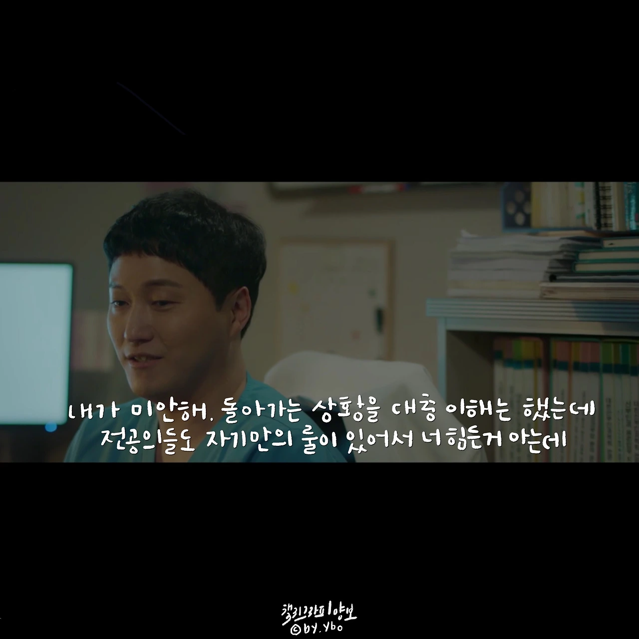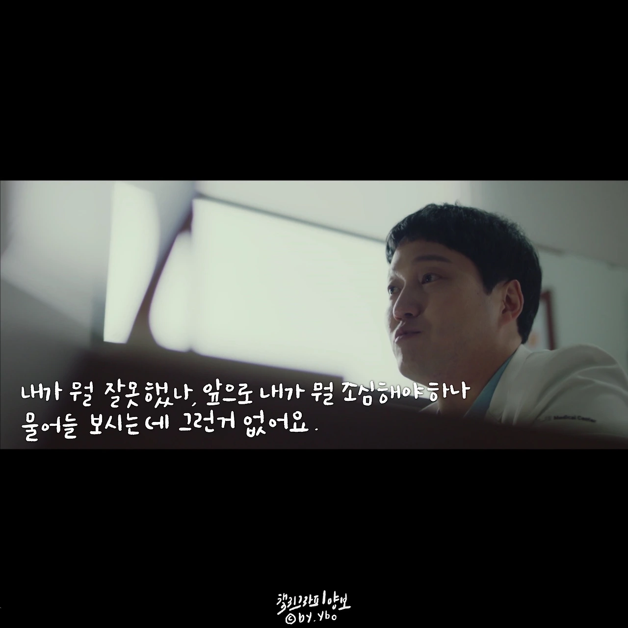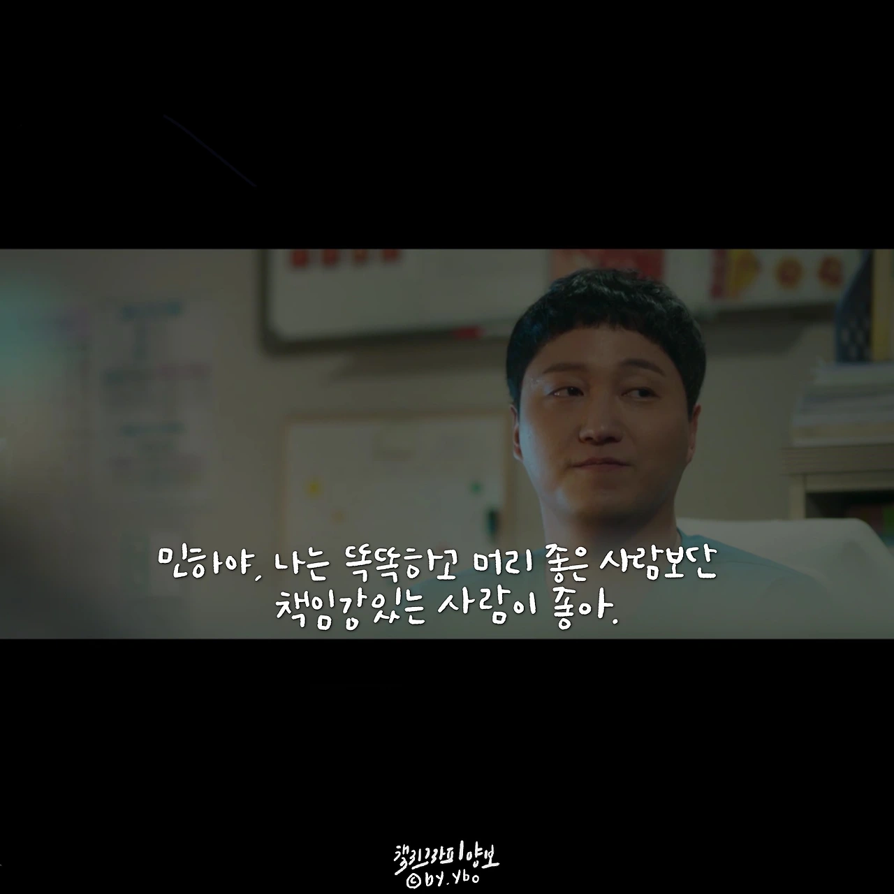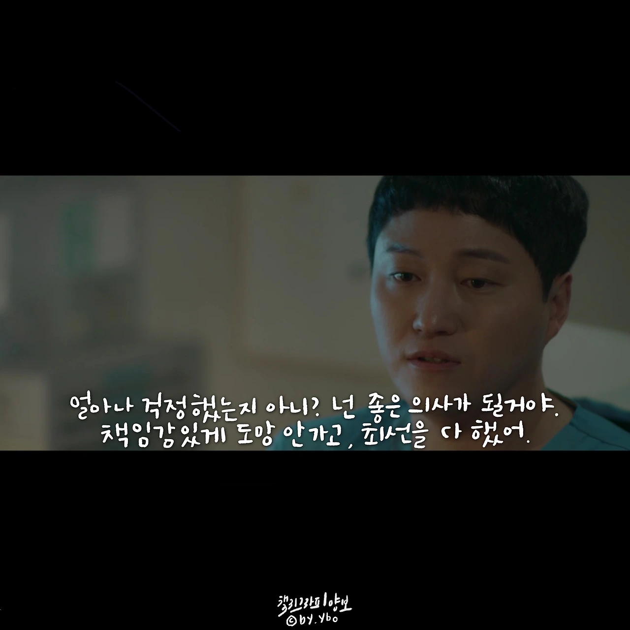 책임감이라고 생각하면 묵직하고 거대한 무엇을 떠올리게 한다. 하지만 곱씹어 보면 그리 크지 않은 무엇일지 모른다. 피하고 싶은 상황에서 도망치지 않고 그 자리를 지키는 것, 이것이 내가 생각하는 책임감의 한 모습이다. 민하는 어려운 환자를 피하지 않았고, 두려운 순간에도 도망치지 않았다. 무엇을, 특별히 하지 못 했지만 그 자리에 서서 지침, 두려움 등 모든 감정들을 감당했다. 의사들 사이에 똑똑하고 머리 좋은 사람이 얼마나 많을까. 이런 환경에서 다름을 나타내는 한 수는 바로 기본에 관한 것일지 모른다. 익숙한 성실함이나 당연하게 생각하며 지켜온 정직함이나 때론 버겁고 특별히 의미 없어 보이는 책임감이 오랫동안 수호되어지고 존중 받아온 이유인지도. 이를 알아주는 고운 눈을 가진 석형 샘의 따뜻한 격려에 함께 위로 받은 장면 속 대사. ...그나저나 너무 바뻐 화장 할 시간도 없었는데, 그 덕에 8화 중 오늘이 젤 예쁘다 상한 마음을 악하게 토해내지 않고 수를 쓰지도 않은 저 곰팅이. 예쁘다 민하샘