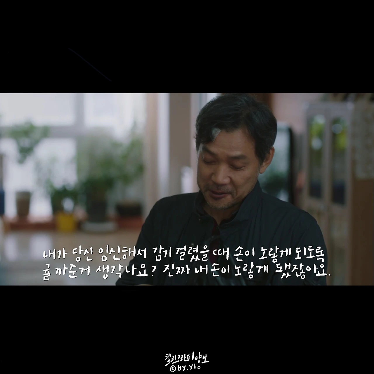 언뜻언뜻 나도 모르게 엄마가 자주 쓰는 말투가 나오고 아빠처럼 행동이 나온다. 그럼에도 그때도 지금도 부모님에 대해 아는 게 없다. 특히 모든 물음에 당신은 상관없다, 너희 좋을 대로 -라고 말하는 아빠의 취향은 거즌 모른다. 이 장면을 보면서 언니와 나는 고개를 주억주억 끄덕였고, ‘너는 알아?’ ‘너는 알고?’ 화면 속 둘째와 셋째의 대사를 눈빛으로 나눴다..