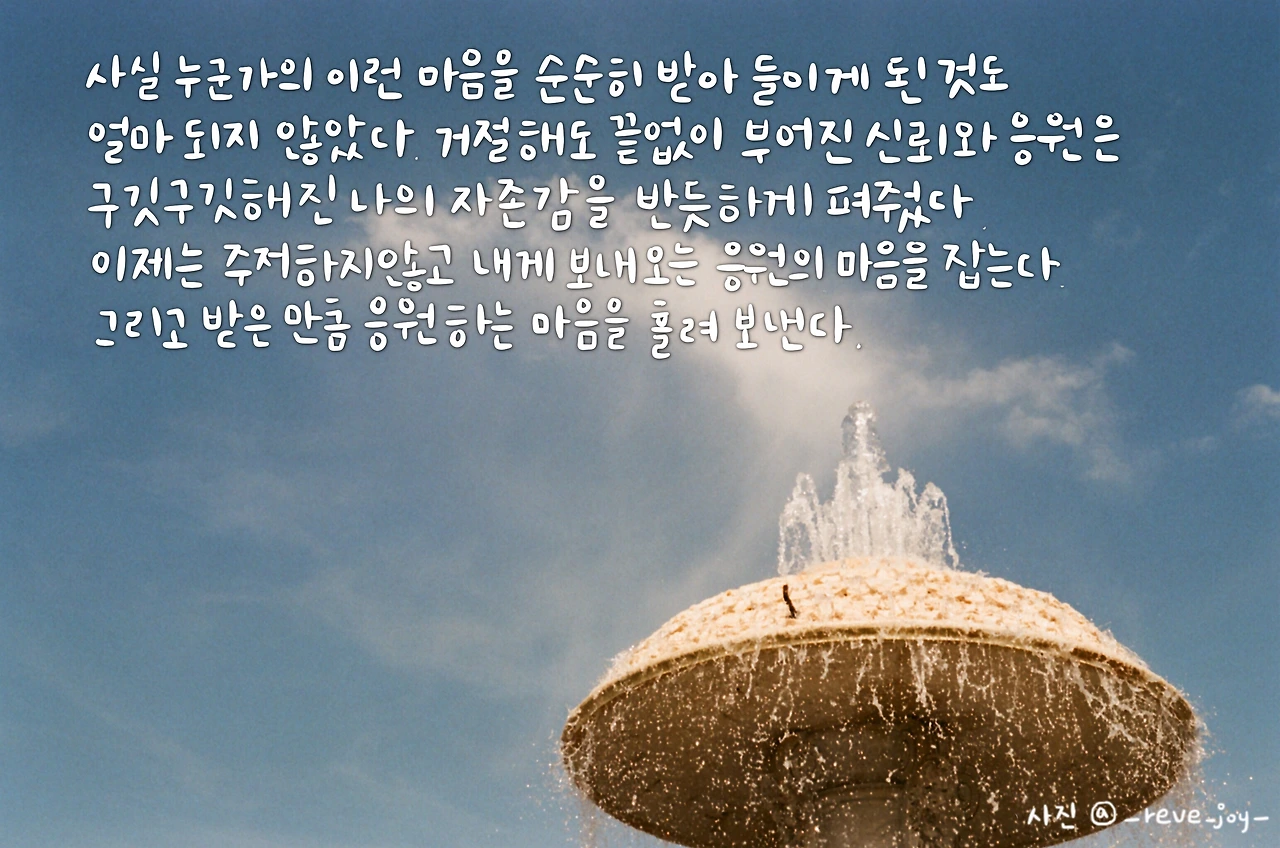 은희가 그랬던 것처럼 나 또한 동료가 건넨 응원을 낯부끄럽다며 손사래 치는 대신 고마운 마음으로 받았다. 사실 누군가의 이런 마음을 순순히 받아들이게 된 것도 얼마 되지 않았다. 거절해도 끝없이 부어준 신뢰와 응원은 구깃구깃해진 나의 자존감을 반듯하게 펴주었다. 이제는 주저하지 않고 내게 보낸 응원의 마음을 잡는다.