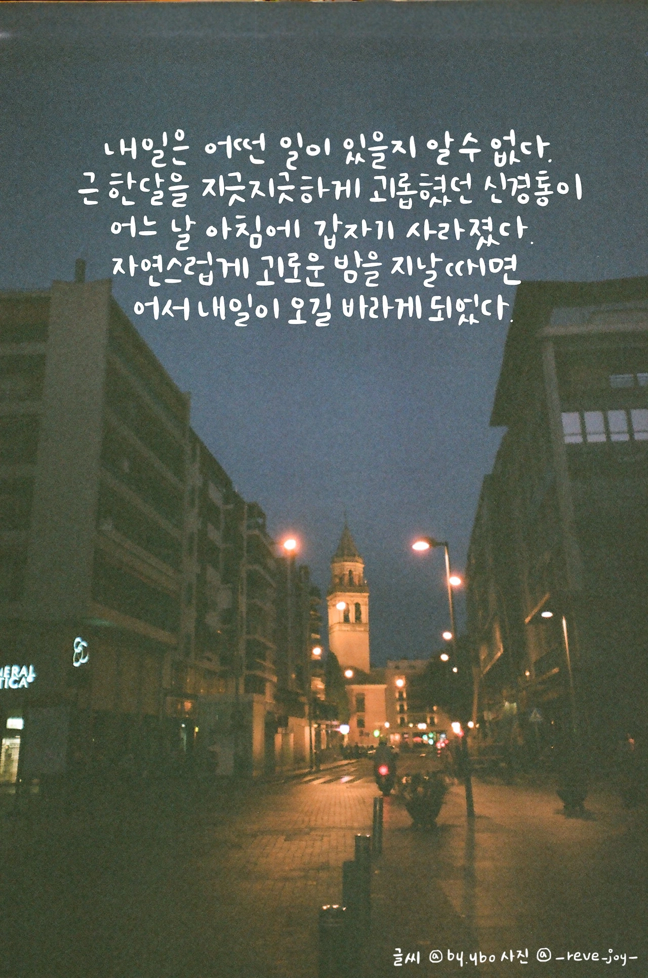 근 한 달을 지긋지긋하게 괴롭혔던 신경통이 어느 날 아침에 갑자기 사라졌다. 돈이 없어 발을 동동 굴던 다음 날 예상하지 못한 곳에서 돈이 들어온 적도 있고, 상처 주던 사람을 끊어 내기로 결심한 것도 누군가를 사랑하고 있다고 깨달은 것도 하룻밤 사이에 일이었다. 이젠 괴로운 밤을 지날 때면 어서 내일이 오길 바라고 있다.